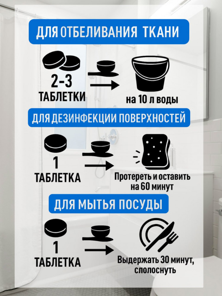 • уборка поверхностей; удаление запахов; дезинфекция пола, стен, дверей, сантехники в помещениях — 1 таблетка на 10 л воды — экспозиция не более 60 минут;
