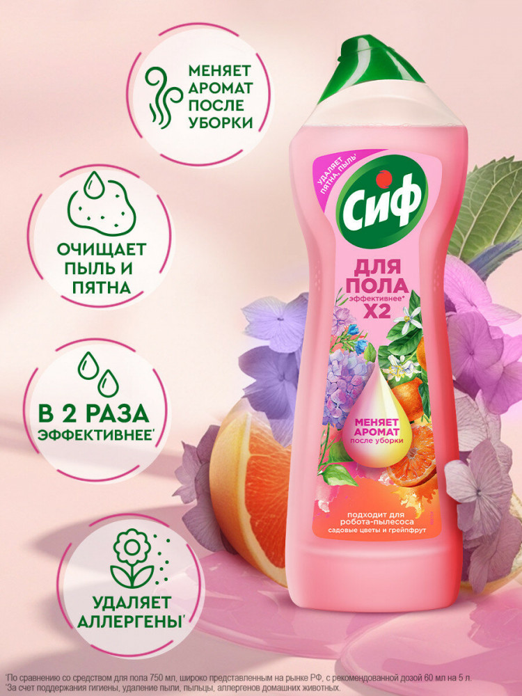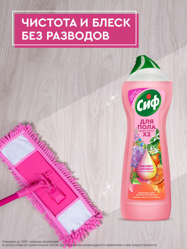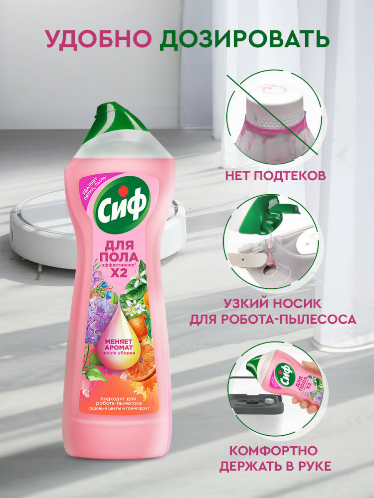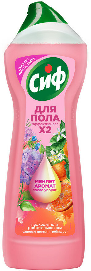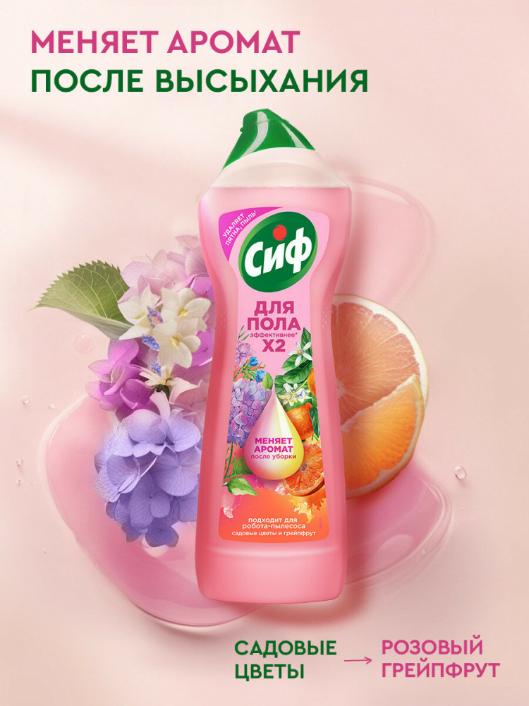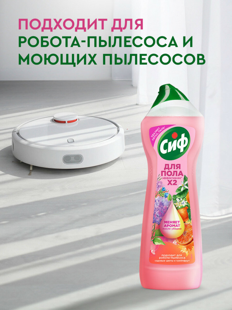 Благодаря уникальной технологии смены аромата, во время уборки вы сможете насладиться нежным цветочным ароматом, а после завершения процесса в вашем доме остается приятный запах сочного грейпфрута. Гель-концентрат для мытья полов не содержит хлор и не требует смывания. Моющее средство для пола Садовые цветы и грейпфрут безопасно для использования в домах с детьми и животными. Гель для уборки дома подходит для использования в роботах-пылесосах. Добавьте моющее средство для полов (1–2 нажатия) в бак с водой, и робот сделает уборку за вас, обеспечивая безупречную чистоту и свежесть в доме. Гель-концентрат для мытья полов Сиф — это выгодная покупка, поскольку одной бутылки нашего продукта хватает до 2 раз дольше.