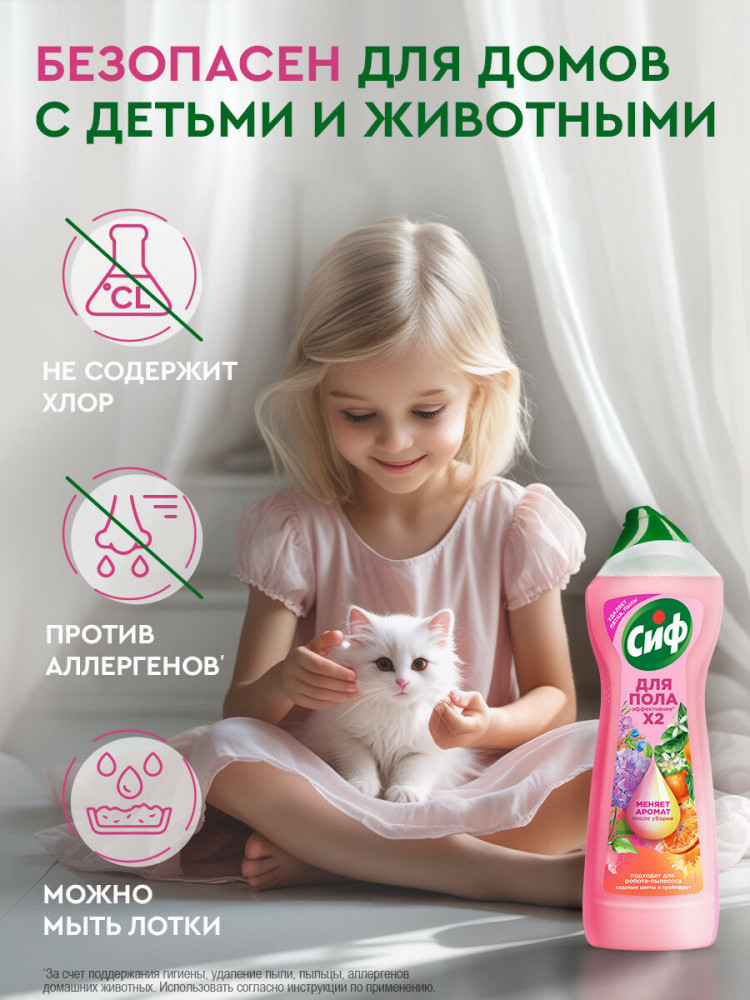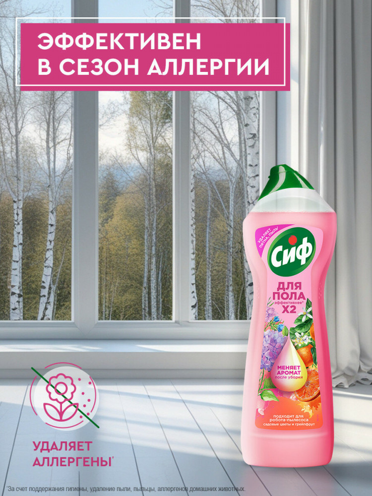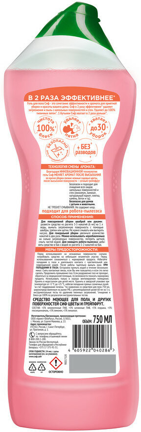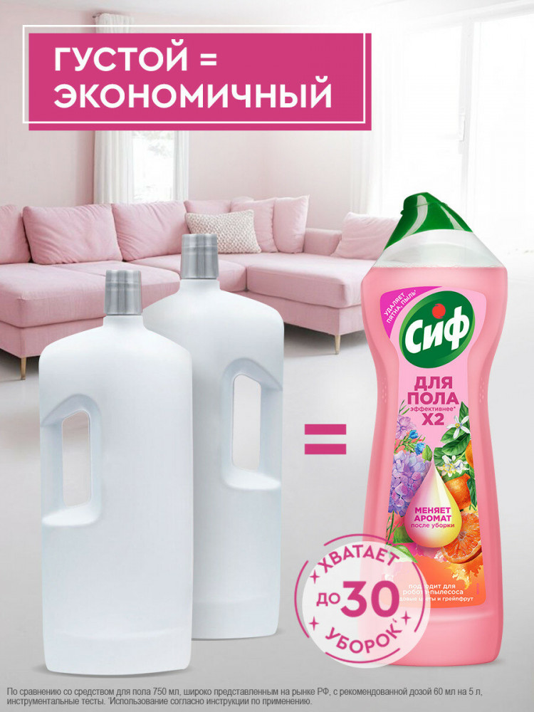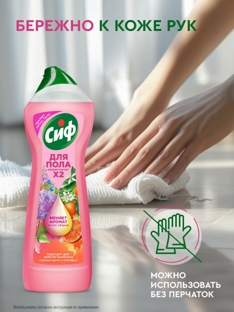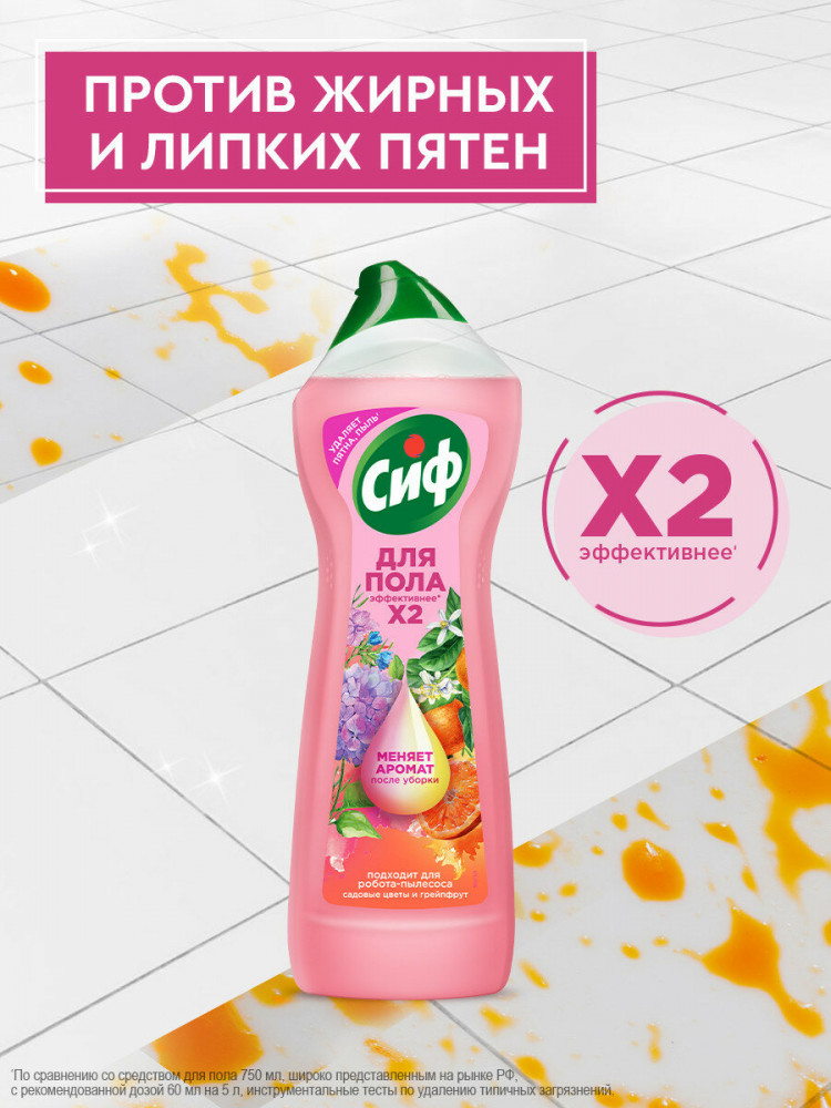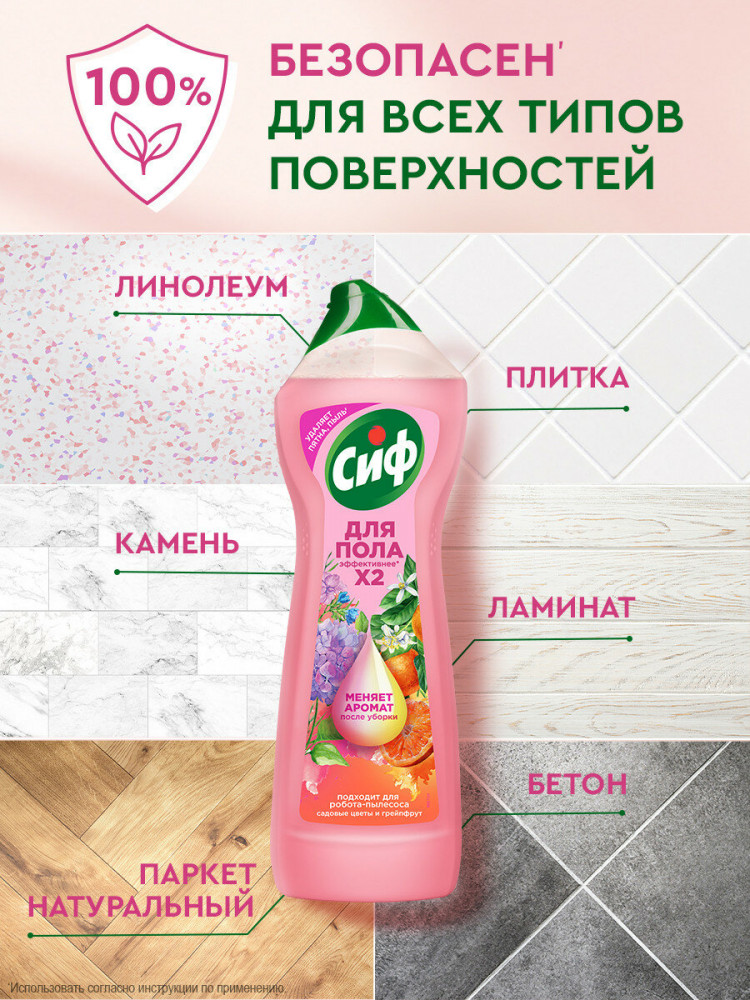 Благодаря уникальной технологии смены аромата, во время уборки вы сможете насладиться нежным цветочным ароматом, а после завершения процесса в вашем доме остается приятный запах сочного грейпфрута. Гель-концентрат для мытья полов не содержит хлор и не требует смывания. Моющее средство для пола Садовые цветы и грейпфрут безопасно для использования в домах с детьми и животными. Гель для уборки дома подходит для использования в роботах-пылесосах. Добавьте моющее средство для полов (1–2 нажатия) в бак с водой, и робот сделает уборку за вас, обеспечивая безупречную чистоту и свежесть в доме. Гель-концентрат для мытья полов Сиф — это выгодная покупка, поскольку одной бутылки нашего продукта хватает до 2 раз дольше.