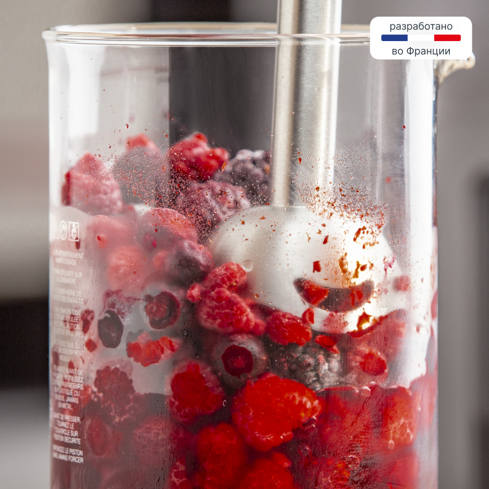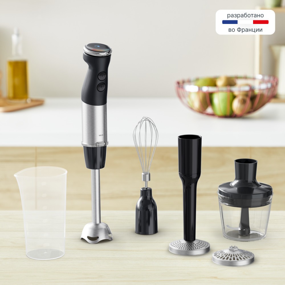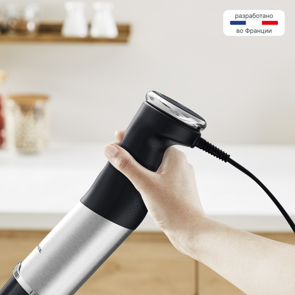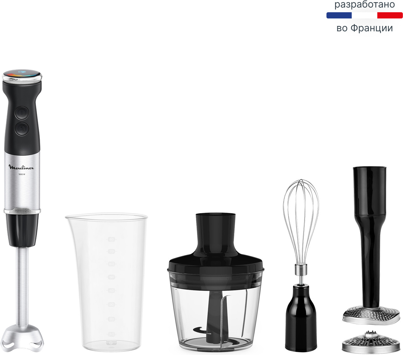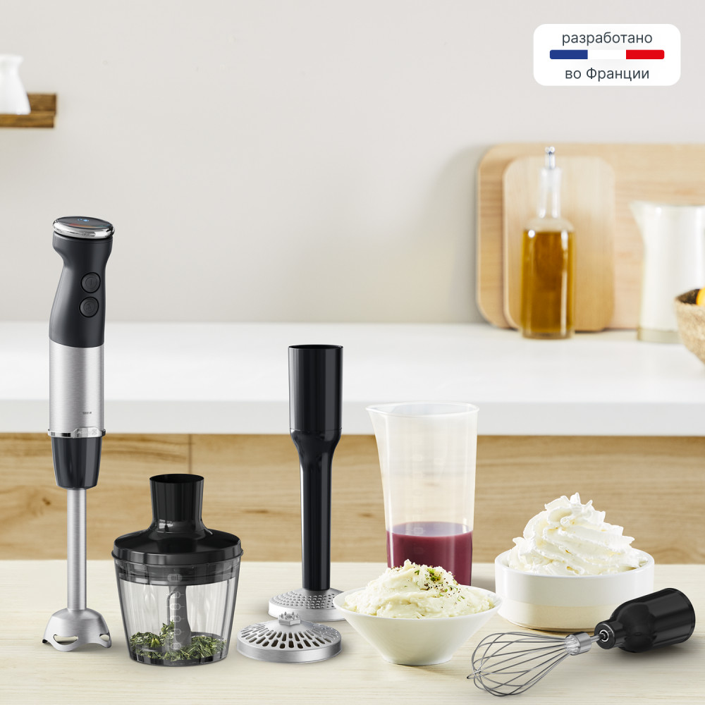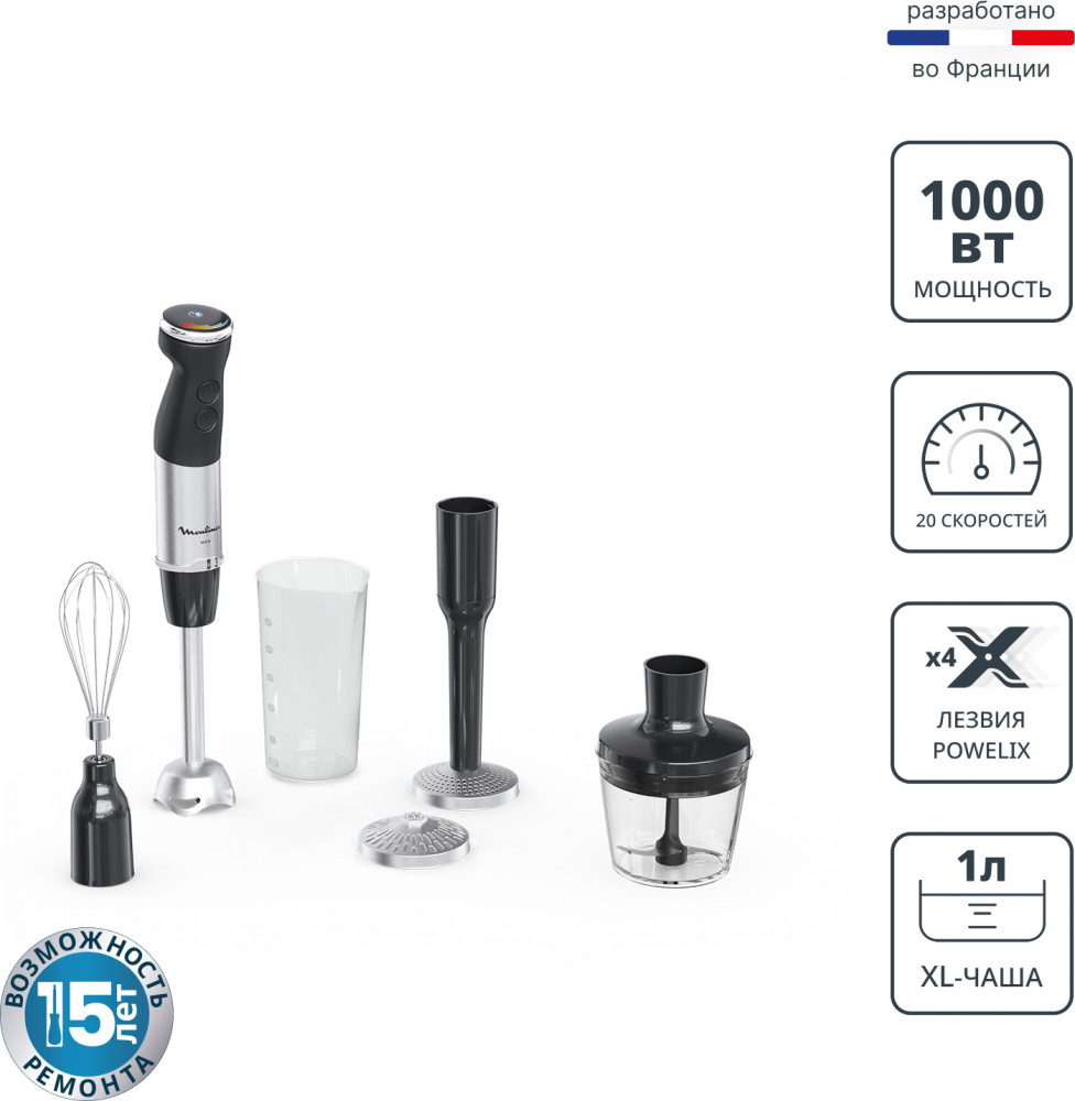 Блендер погружной Moulinex Quickchef+ DD674810 выполнен в черном пластиковом корпусе с нескользящей прорезиненной ручкой. Погружную часть из нержавеющей стали и другие съемные элементы можно мыть в посудомоечной машине. Модель оснащена кнопками включения и активации турборежима для измельчения ягод и подобных продуктов, поворотным регулятором для плавного переключения между 20-ю скоростями. |