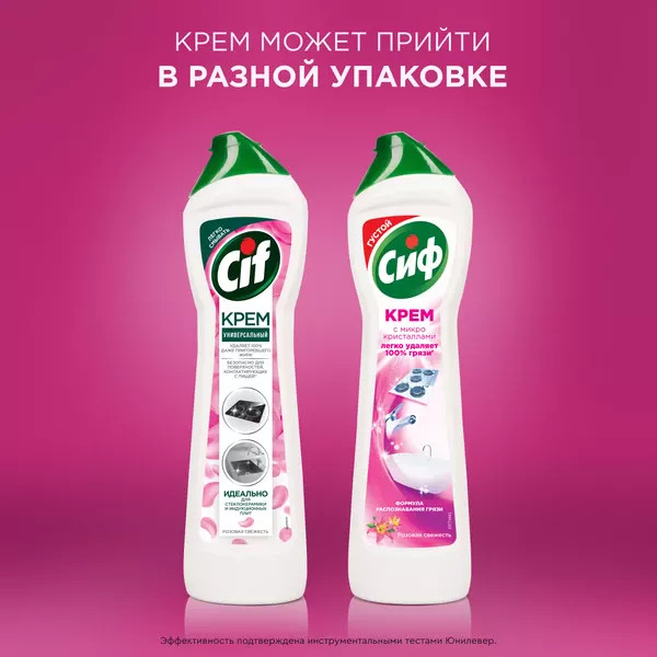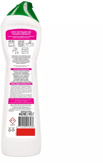 Устали от известкового налета? Не можете удалить пятна в ванной или на кухне? Не нравятся царапины после уборки? Густой чистящий крем Сиф «Розовая свежесть» 100% удалит грязь на кухне и в ванной, оставляя поверхности 100% сияющими и гладкими. Крем удаляет грязь благодаря силе микрокристаллов, которые помогают добиться чистых, сияющих и гладких поверхностей, оставляя аромат душистого иланг-иланг и фрезии. Легко нанести, легко протереть, легко смыть. Крем проникает и полностью удаляет такие въевшиеся и застарелые загрязнения, как: засохший жир, пригоревшая еда, мыльные разводы и известковый налет. Притом, он не царапает поверхность и обладает приятным свежим цветочным запахом.
