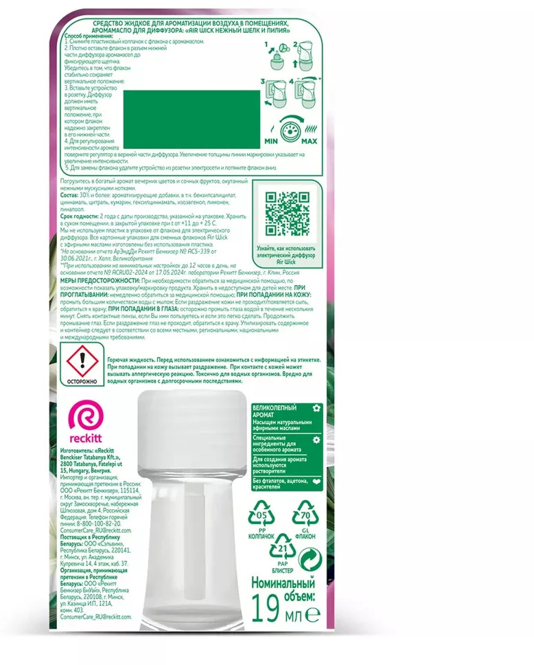 Способ применения: снимите пластиковый колпачок с флакона. Плотно вставьте флакон в разъем нижней части диффузора аромамасел до фиксирующего щелчка. Убедитесь в том, что флакон с аромамаслом стабильно сохраняет вертикальное положение. Вставьте устройство в сборе в свободную розетку электросети. Для регулирования интенсивности аромата поверните регулятор в верхней части диффузоров. Увеличение толщины линии маркировки указывает на увеличение интенсивности. Для замены флакона удалите устройство из розетки электросети и потяните флакон вниз.