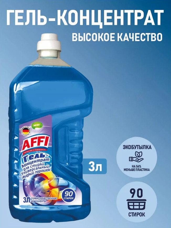 Гель для стирки Affi — отличное средство, которое поможет избавиться от загрязнений любого происхождения на одежде из разных типов ткани. Подходит для ручной стирки и всех типов стиральных машин. Так как жидкий порошок не содержит агрессивных компонентов, даже при частых стирках на вещах не появляются признаки износа. Они не теряют цвет, а структура ткани остается неизменной. При этом комплекс активных веществ эффективно справляется с удалением даже сложных пятен (от вина, ягод и пр.). Гель может использоваться при невысокой температуре, даже при 30-60 градусах хорошо выводит любые загрязнения. Средство легко выполаскивается, не оставляет мыльных разводов на одежде, хорошо подходит для белого и черного, а также любых цветных изделий. Может применяться для стирки одежды из разных видов тканей. Это могут быть изделия из хлопка, льна, поплина, шелка, атласа, сатина, кашемира и прочих материалов.