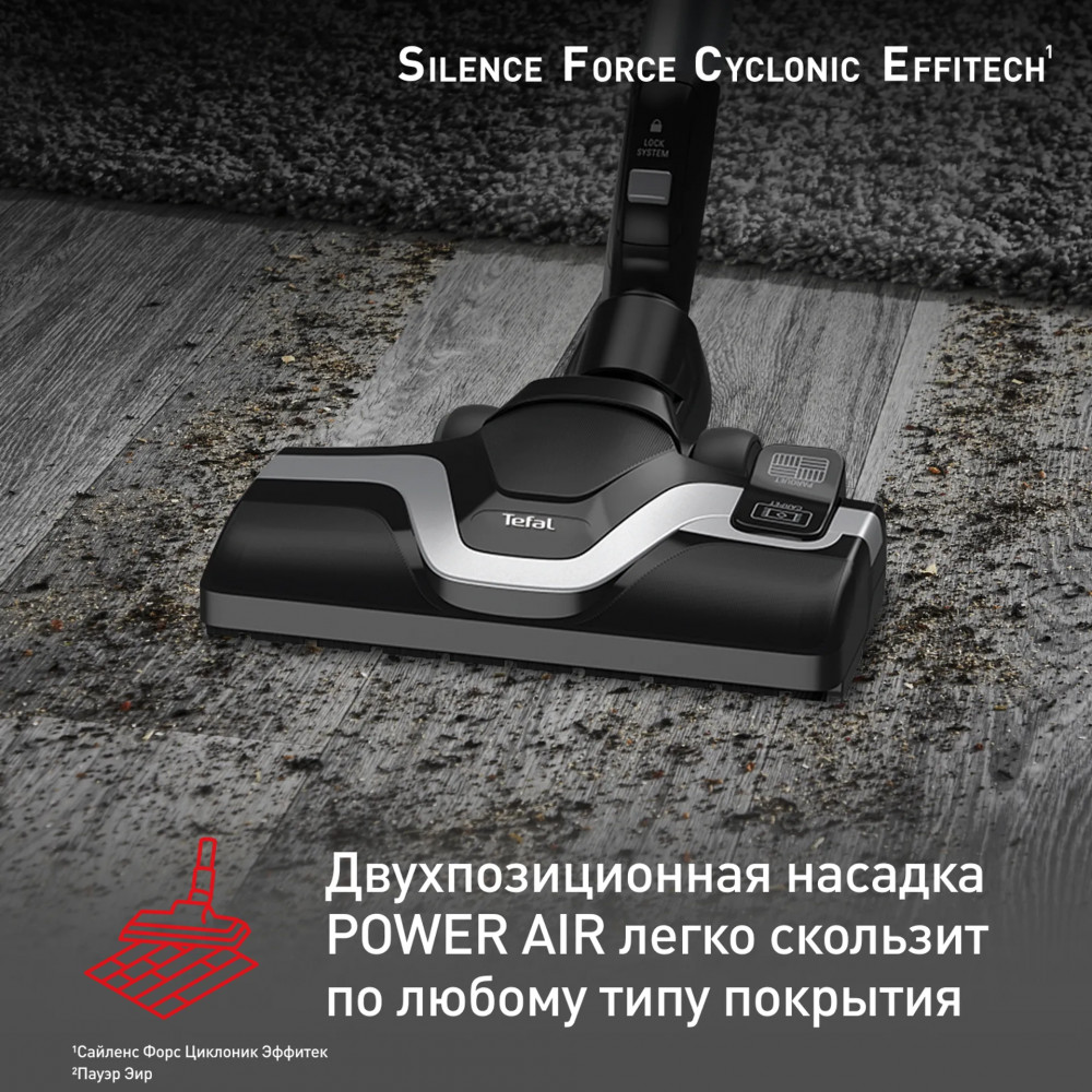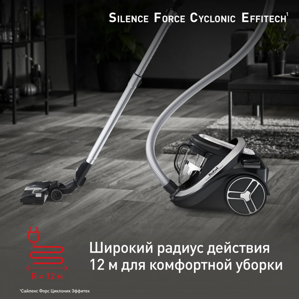 Пылесос Silence Force Cyclonic Effitech от Tefal оснащен энергоэффективным мотором Effitech, который обеспечивает выдающуюся производительность всасывания и глубокую очистку при меньшем энергопотреблении. Инновационный безмешковый пылесос впечатляет низкой громкостью работы — всего 59 дБ(А) даже на самом мощном режиме, что сравнимо с громкостью разговора. А его радиус действия 12 м и вместительный контейнер 2.5 л обеспечивают непревзойденное удобство во время уборки день за днем.