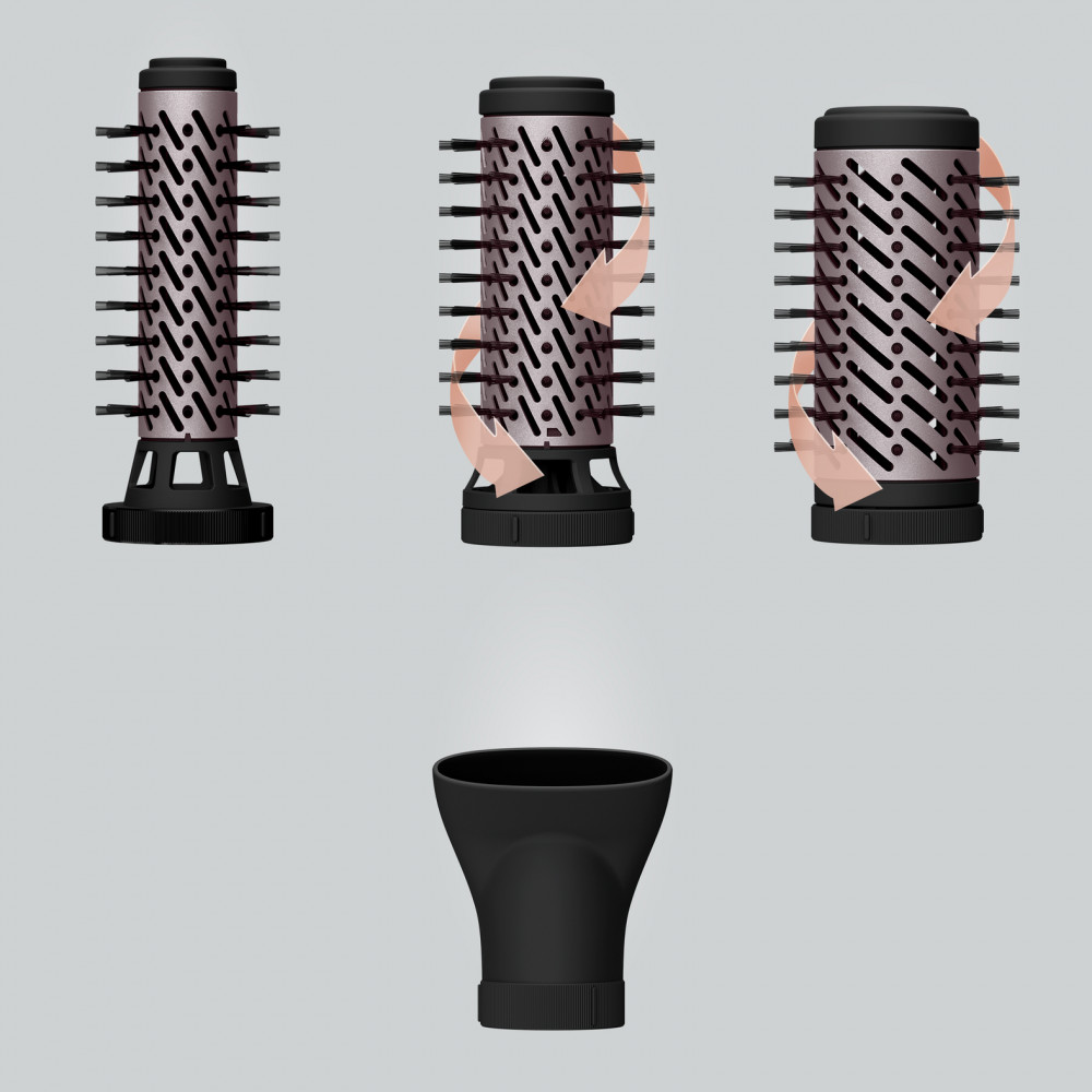Мощность 1000 Вт обеспечивает эффективную и быструю сушку феном без вреда для волос. Фен-щетка в корпусе оптимального диаметра удобно лежит в руке, делая укладку волос комфортной и легкой. От невероятного объема до четких локонов — создавайте прически на волосах любой длины с помощью 2 вращающихся насадок (40/50 мм), 1 статичной насадки (30 мм) и концентратора. Ионная технология и керамическое покрытие уменьшают статику и пушистость волос, делая их гладкими, послушными и блестящими. Два режима скорости/температуры для создания вашей безупречной укладки + обдув холодным воздухом для стойкой фиксации прически в течение всего дня.