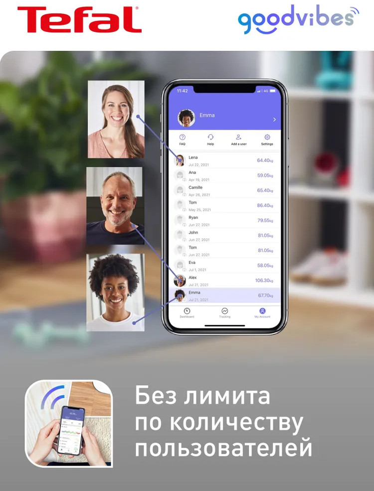 • поддержка нескольких пользователей: Весы могут использоваться всей семьей или с друзьями, не имея лимита по количеству пользователей.