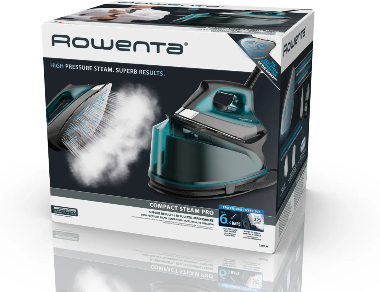 Мощный, эффективный и компактный: парогенератор Rowenta Compact Steam Pro позволяет легко добиваться профессионального результата глажения. Давление пара в 6.3 бар моментально разгладит вещи, подавая его со скоростью 325 г/мин при паровом ударе, а запатентованная подошва Microsteam 400HD Laser обеспечивает лучшее распределение пара среди аналогов. Парогенератор не только эффективен в работе, но и удобен при хранении — его компактный корпус помещается на площади, равной листу формата А4. |