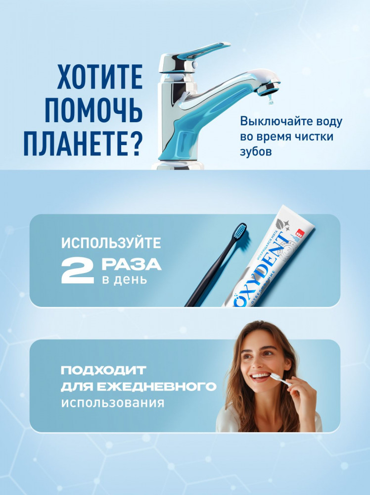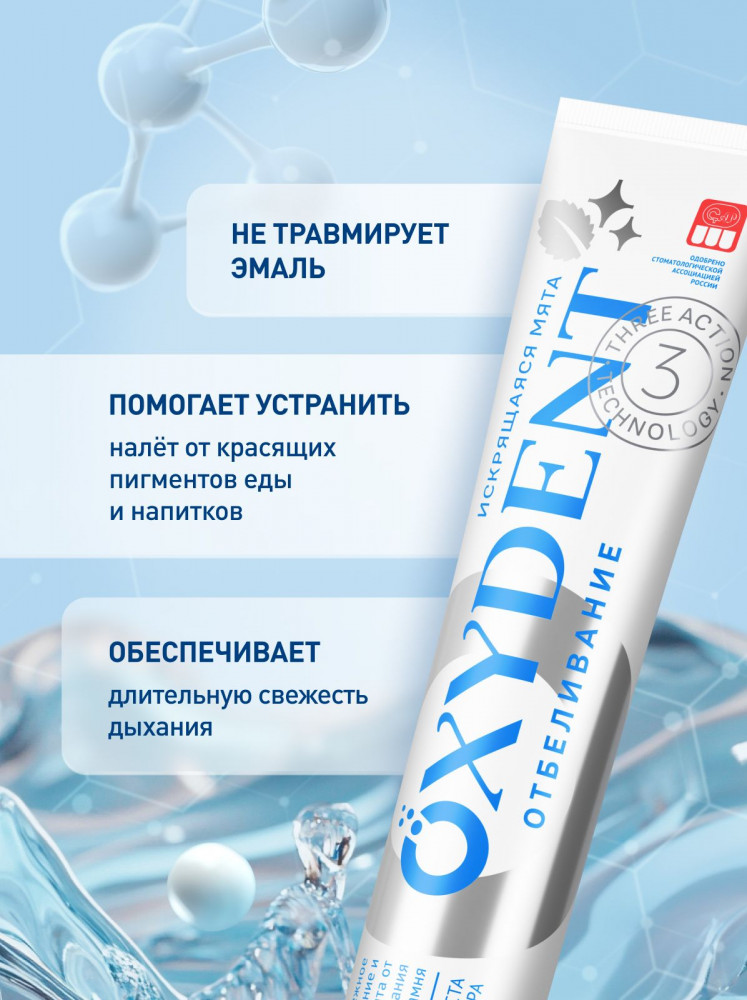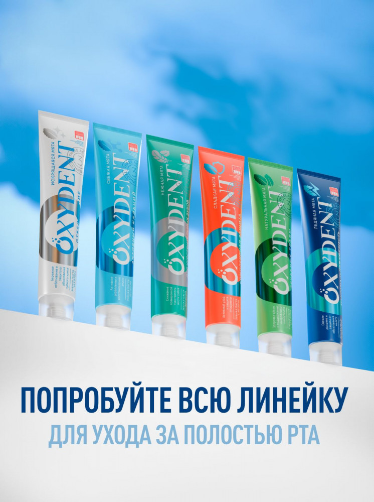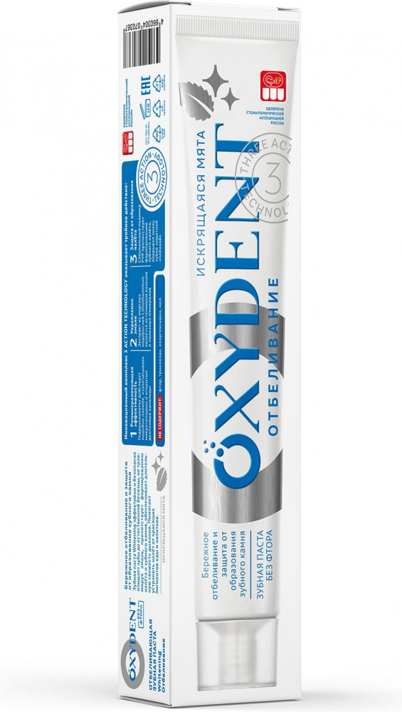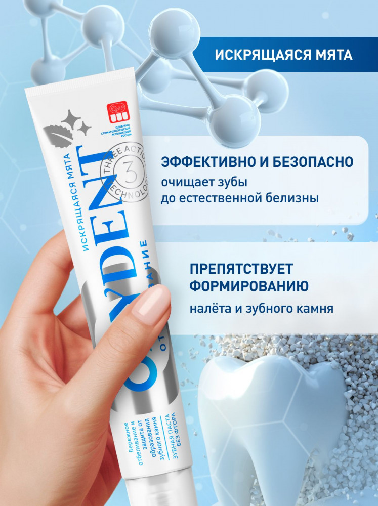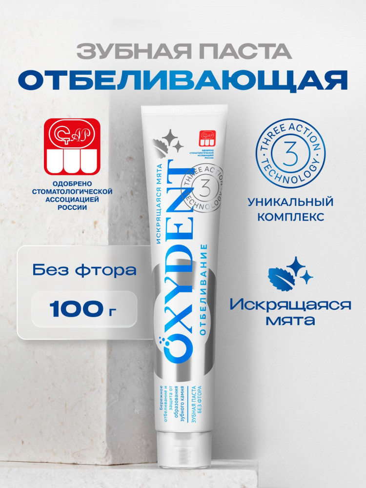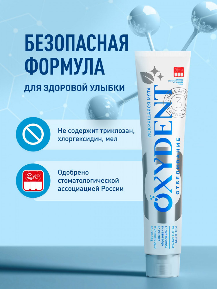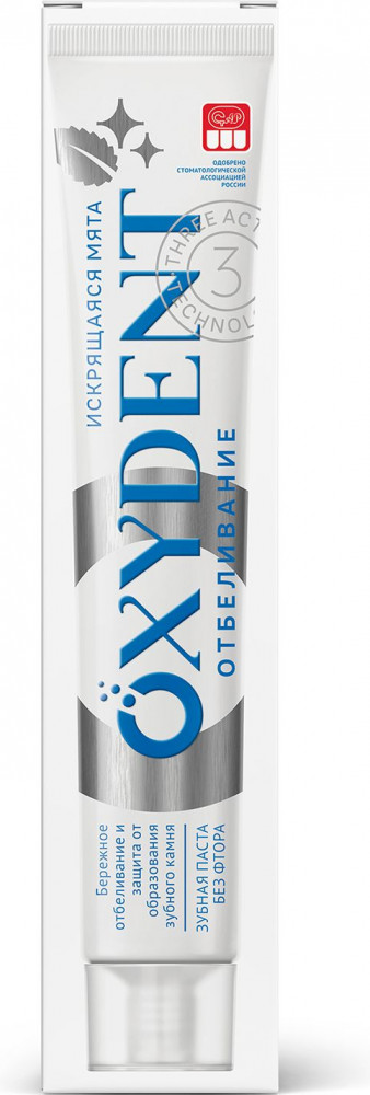Зубная паста Oxydent идеально подходит для ежедневного использования и рекомендована к применению Стоматологической Ассоциацией России — крупнейшей профессиональной организацией стоматологов в России. Паста не содержит фтор, триклозан, хлоргексидин, мел. Обеспечивает безупречную чистоту и длительную свежесть дыхания, не травмируя эмаль и не повышая чувствительность зубов.
