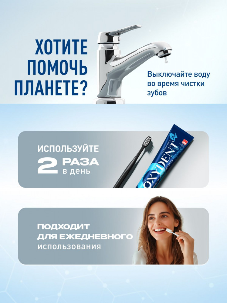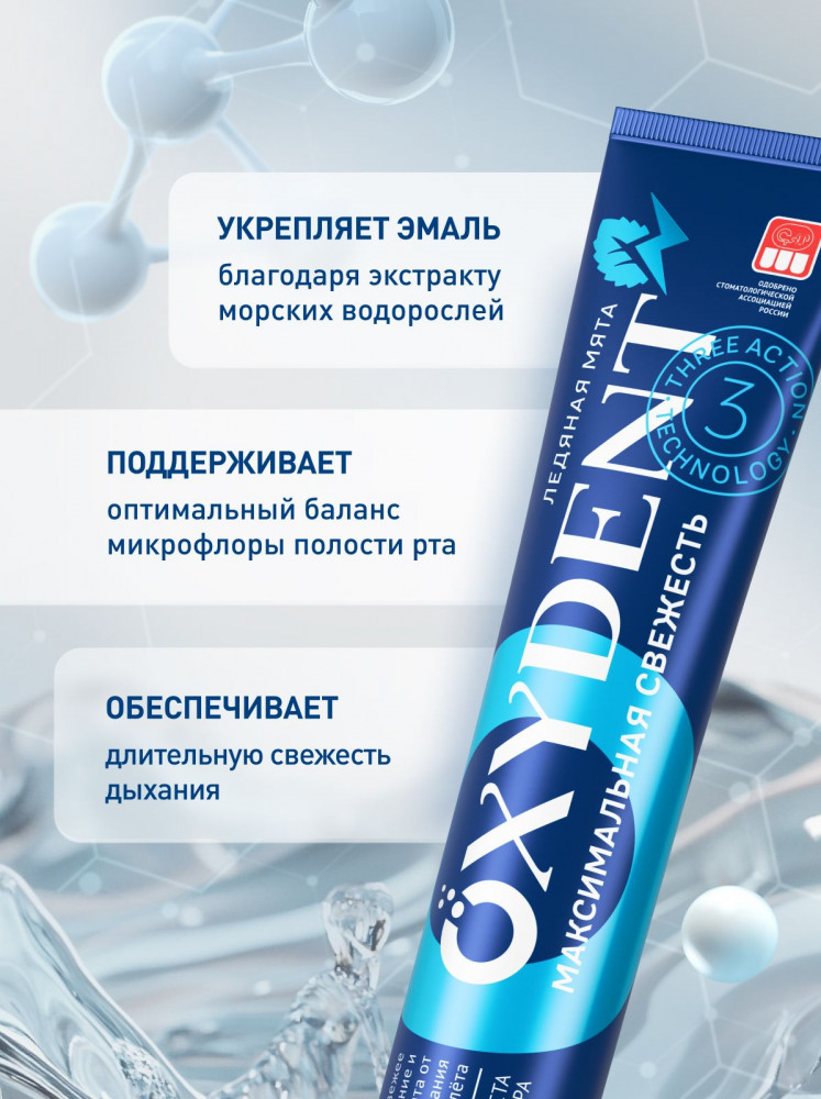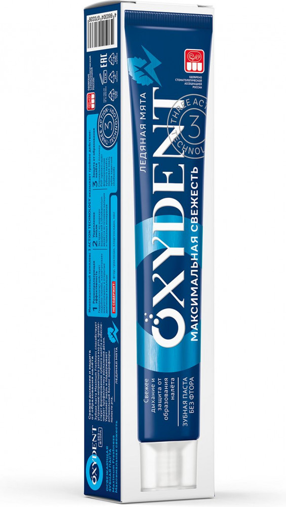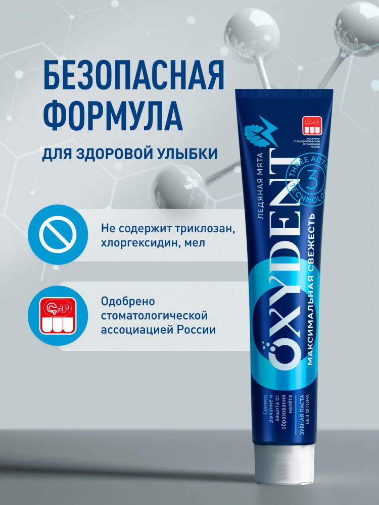 Зубная паста Oxydent идеально подходит для ежедневного использования и рекомендована к применению Стоматологической Ассоциацией России — крупнейшей профессиональной организацией стоматологов в России. Паста не содержит фтор, триклозан, хлоргексидин, мел. Обеспечивает безупречную чистоту и длительную свежесть дыхания, не травмируя эмаль и не повышая чувствительность зубов.