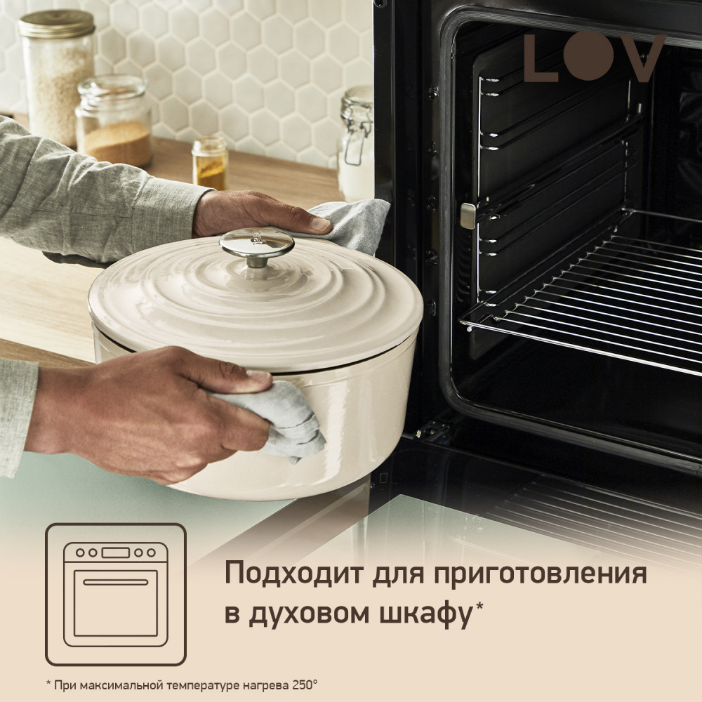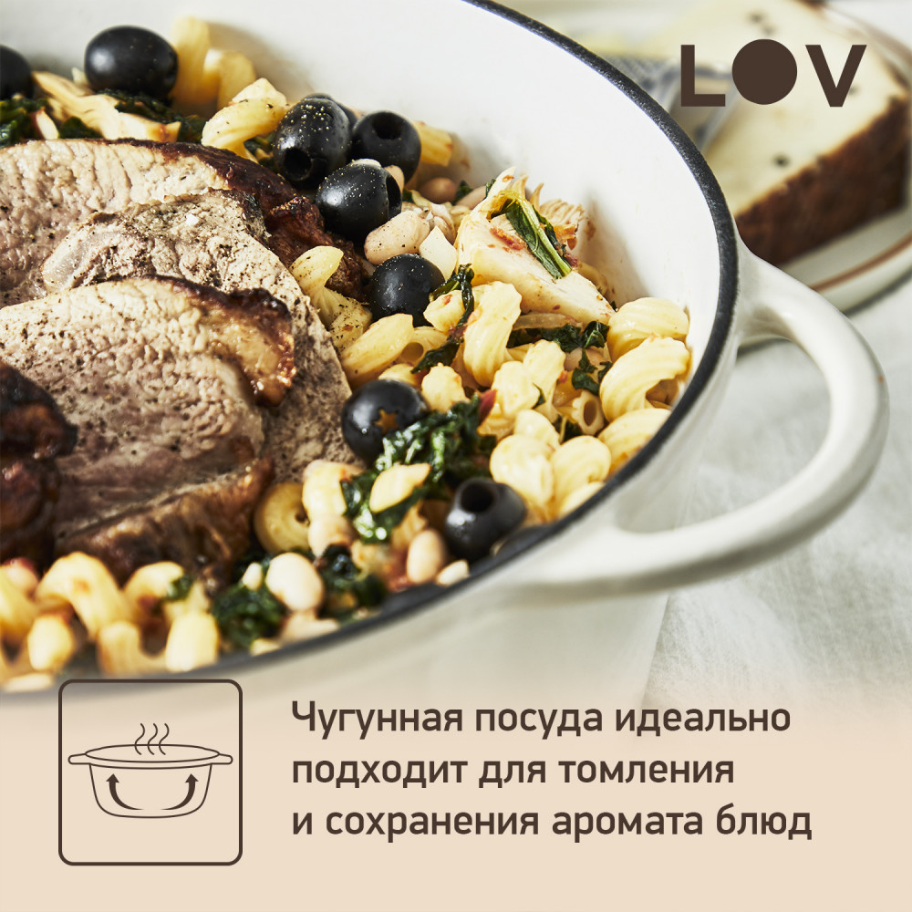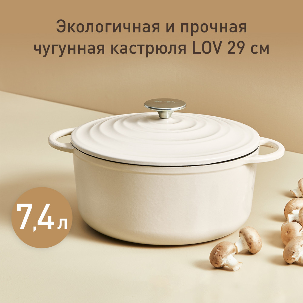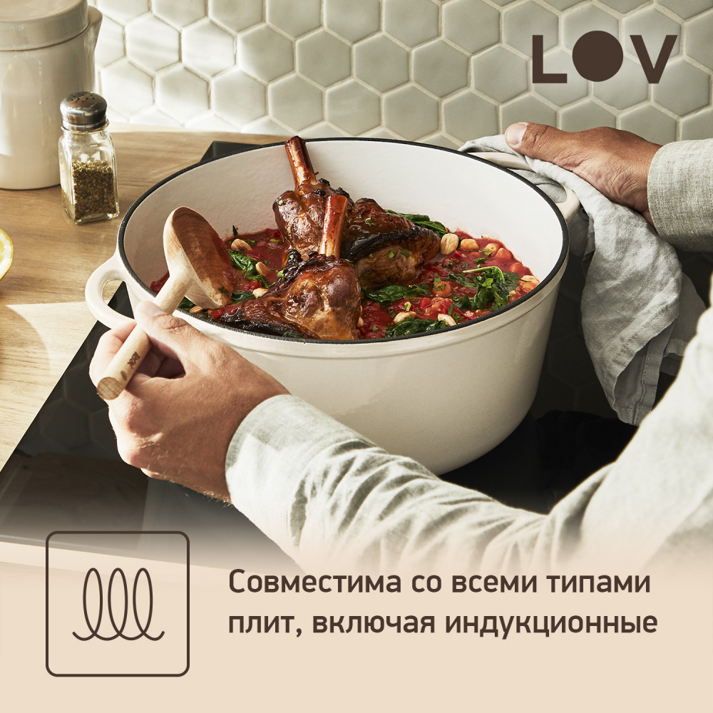 Благодаря плотно прилегающей крышке и сохранению тепла кастрюля помогает легче добиваться идеального результата с привычными рецептами и проще осваивать новые — их можно взять из бесплатной электронной книги. Уверенно готовьте на любом типе варочной поверхности и даже в духовке — LOV поможет вашим умениям раскрыться еще больше. Посуда представлена в различных красивых естественных цветах и формах. Посуда изготовлена из чугуна, который отлично сохраняет тепло, прогревается равномерно, а эмалевое покрытие защищает от коррозии.