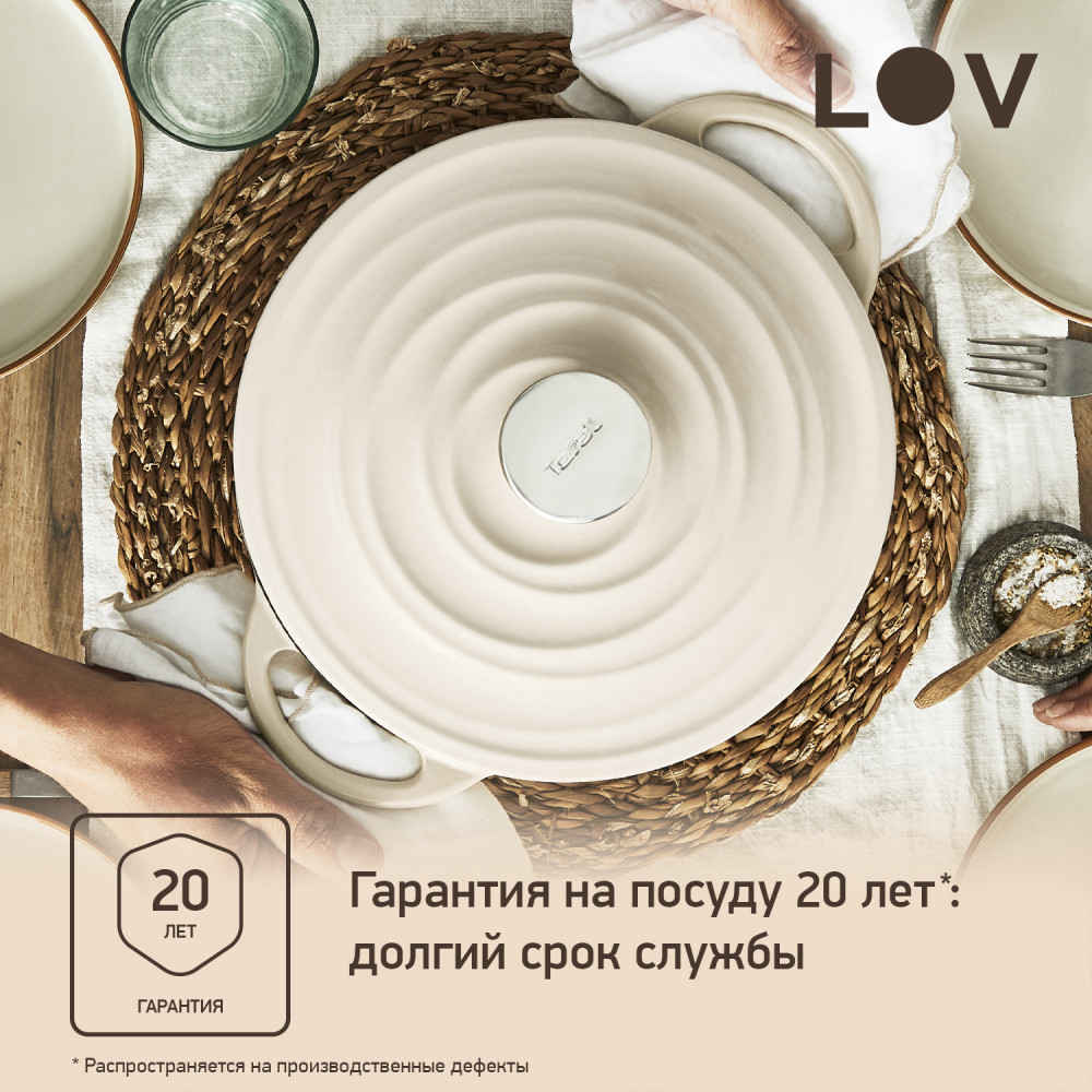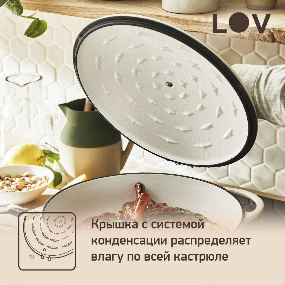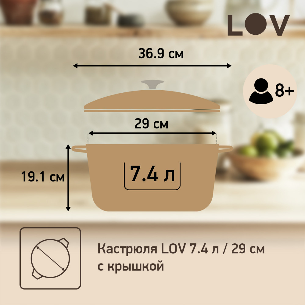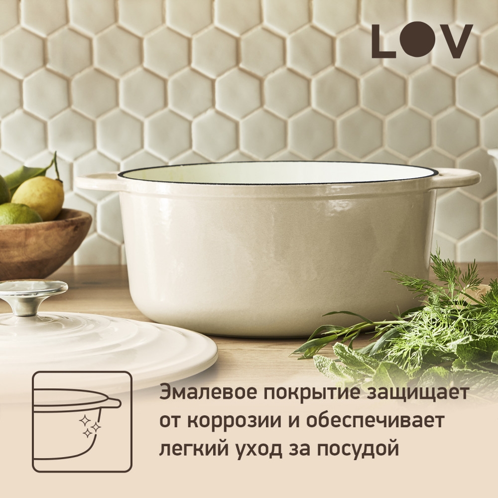 Благодаря плотно прилегающей крышке и сохранению тепла кастрюля помогает легче добиваться идеального результата с привычными рецептами и проще осваивать новые — их можно взять из бесплатной электронной книги. Уверенно готовьте на любом типе варочной поверхности и даже в духовке — LOV поможет вашим умениям раскрыться еще больше. Посуда представлена в различных красивых естественных цветах и формах. Посуда изготовлена из чугуна, который отлично сохраняет тепло, прогревается равномерно, а эмалевое покрытие защищает от коррозии.