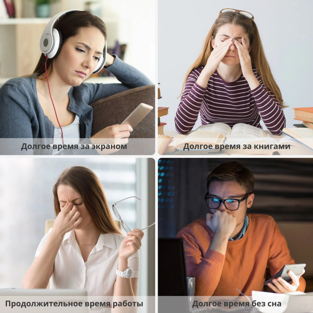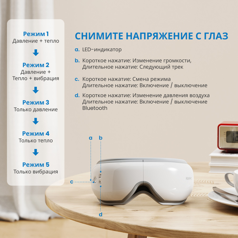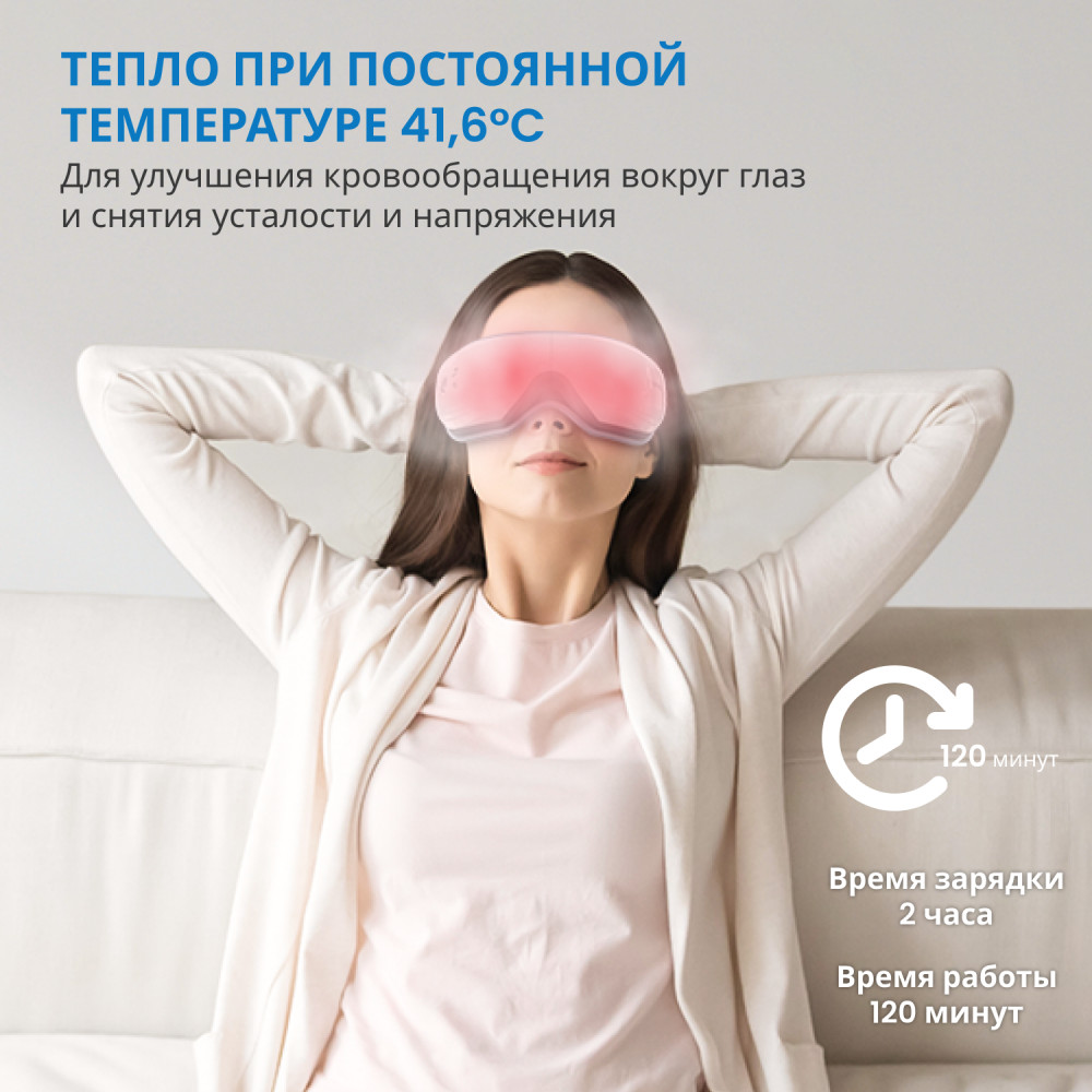 В данный момент этот товар отсутствует в продаже. Возможно, у нас найдется аналогичный или похожий товар здесь. После долгого рабочего дня или учебы, вибромассажер поможет вам снять усталость с глаз. Для более комфортного использования вы можете подключить его к смартфону по Bluetooth и наслаждаться музыкой во время массажа. Электронный вибро массажер оснащен 5 режимами работы: давление с подогревом, давление с вибрацией и подогревом, только давление, только тепло, только вибрация. Массажер стимулирует кровообращение зоны вокруг глаз, лобно-височной области и расслабление глазодвигательных мышц. Снижает частоту приступов головной боли и улучшает качество сна. Он так же усиливает лимфодренаж в верхней части лица, помогая от отеков, а тепловое воздействие в комбинации с вибромассажем является терапией синдрома сухого глаза.