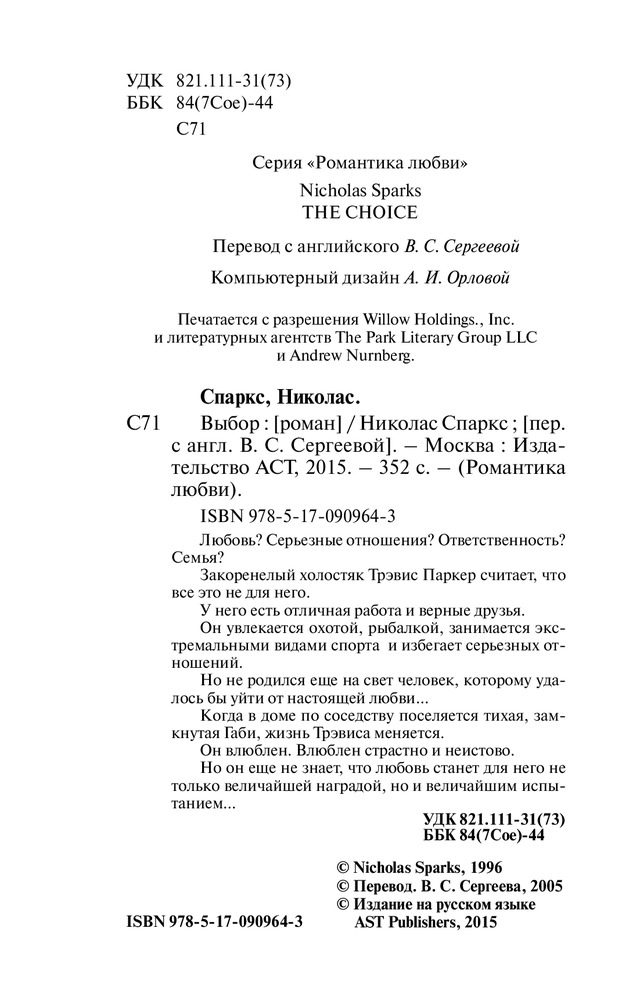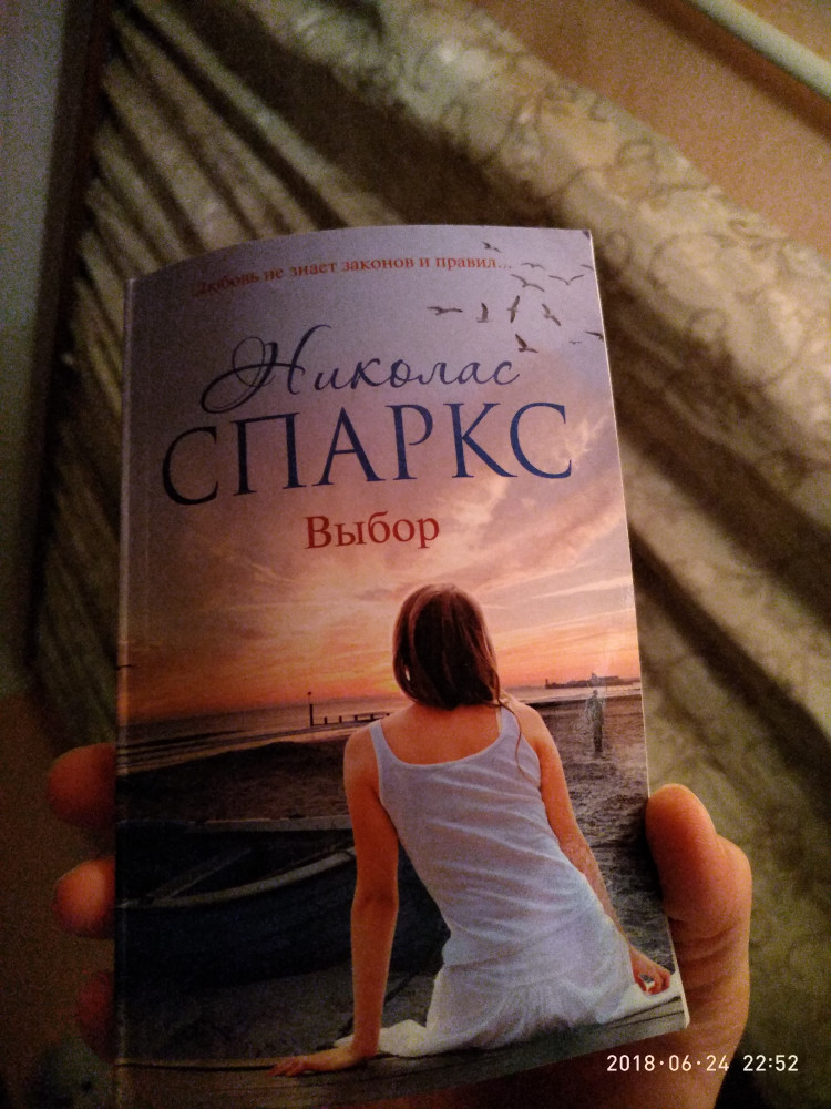 В первую очередь хотела бы выразить благодарность этому сайту. Здесь я заказывала уйму книг, все они были в хорошем качестве. Мне очень нравятся книги Николаса Спаркса, и его книга "Выбор" с первых строк затянула меня в замечательную историю любви. Прочла на одном дыхании. Всем советую, вы не пожалеете)