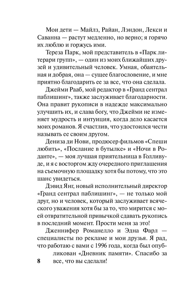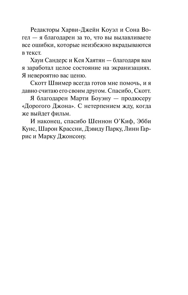 Спасибо вам, дорогие мои, за то что ждали меня с гастролей и держали мою посылку с данной книгой до последнего. Спасибо за то что мой первый раз вообще заказа в интернете прошел великолепно. Милая девушка (к сожалению не помню имени, прошу меня простить), яркая брюнетка, которая в принципе все объяснила: про посылку, про купоны, про возможности заказа. Спасибо вам за все огромное, книга просто великолепна не мог оторваться от нее целый день, прочитал от корки до корки. После просмотра фильма я мечтал прочитать эту книгу (хотя Николас Спаркс у меня идет с трудом), я искал ее изначально везде, по всем книжным магазинам города Алматы, но только вы смогли осуществить мою такую маленькую но все же мечту! Люблю вас! И теперь отныне и навсегда, до последнего только ваш Зенан Каллен!