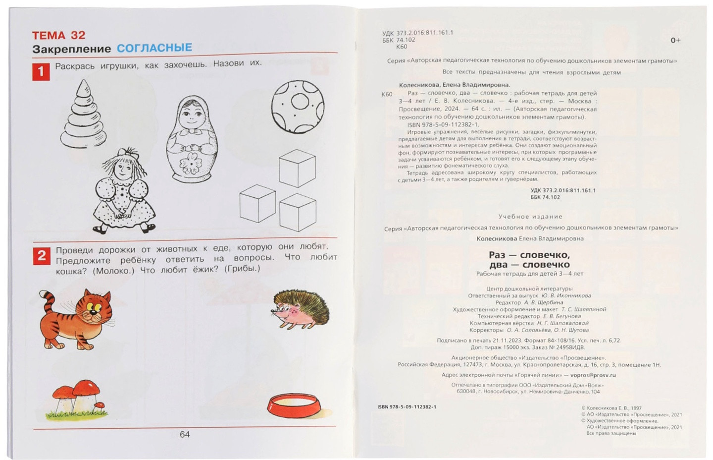 Рабочая тетрадь «Раз - словечкр, два - словечко» — это увлекательный инструмент для развития речи и подготовки к школе детей 3-4 лет. Автор Елена Колесникова создала пособие, которое помогает малышам освоить основы русского языка через игры, загадки и весёлые задания, формируя познавательный интерес и готовя к следующему этапу обучения.