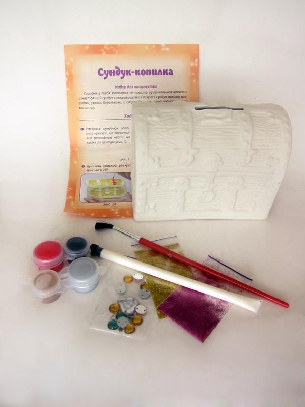 Комплектация: краски акриловые, кисточка, керамический сундук-копилку, клей ПВА, стразы, блестки, инструкция.