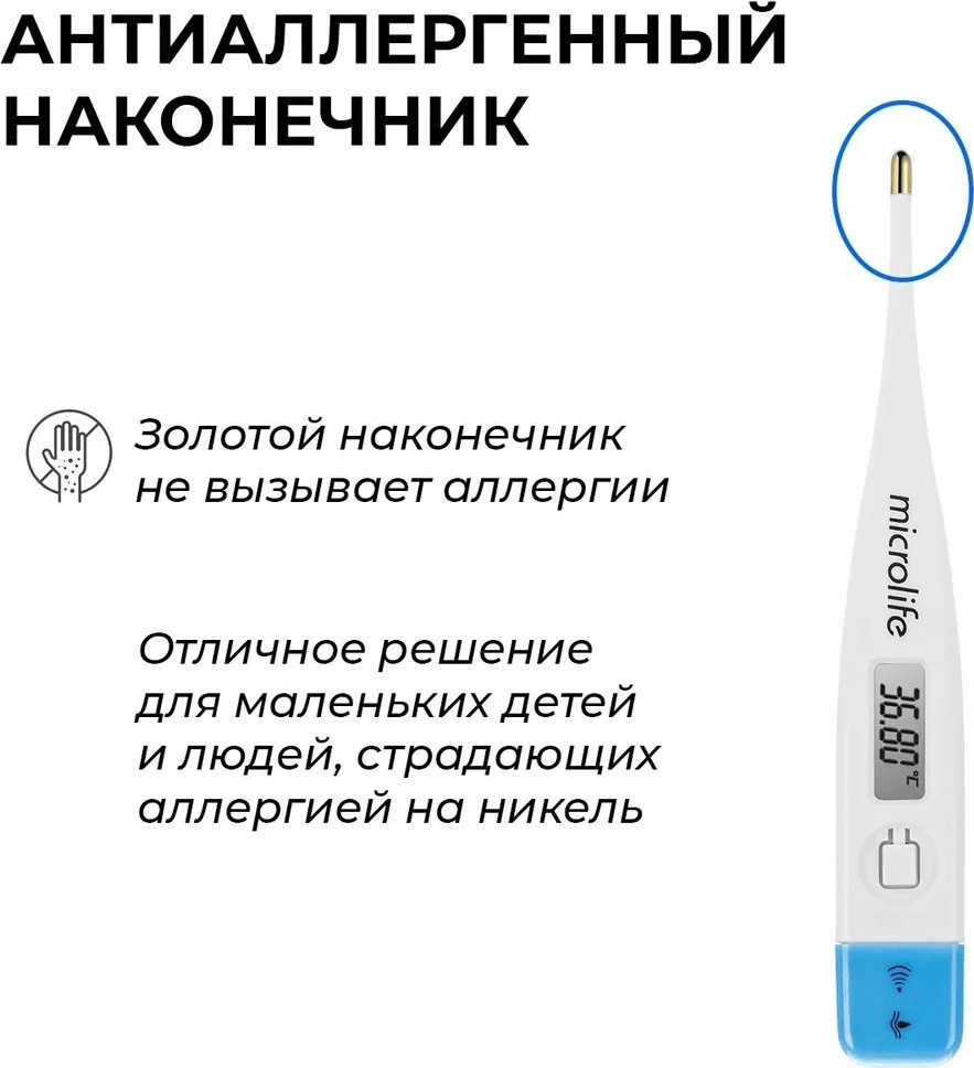 Цифровой термометр Microlife MT 1622 — предназначен для измерения температуры тела человека тремя способами: орально, в подмышечной впадине (аксиллярно) или ректально. Имеет золотой наконечник GoldTemp. Золотой наконечник не вызывает аллергии. Это отличное решение для маленьких детей и людей, страдающих аллергией на никель. Термометр максимально безопасен, поскольку не содержит ртуть и стекла. Имеет водонепроницаемый корпус и память последнего измерения. Скорость измерения составляет от 60 секунд. |