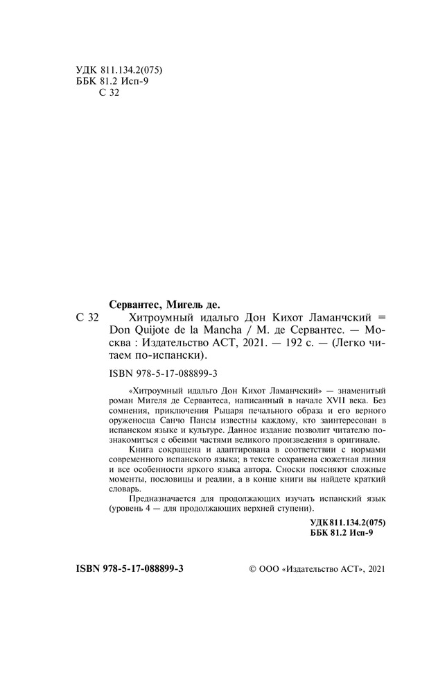 💳 Оплатить за товар можно при получении 🇰🇿 Есть бесплатная доставка по Казахстану от 1 дня 🎁 Копите бонусы с каждой покупки Серия: Легко читаем по-испански "Хитроумный идальго Дон Кихот Ламанчский" - знаменитый роман Мигеля де Сервантеса, написанный в начале 17 века. Без сомнения, приключения Рыцаря печального образа и его верного оруженосца Санчо Пансы известны каждому, кто заинтересован в испанском языке и культуре. Данное издание позволит читателю познакомиться с обеими частями великого произведения в оригинале. |