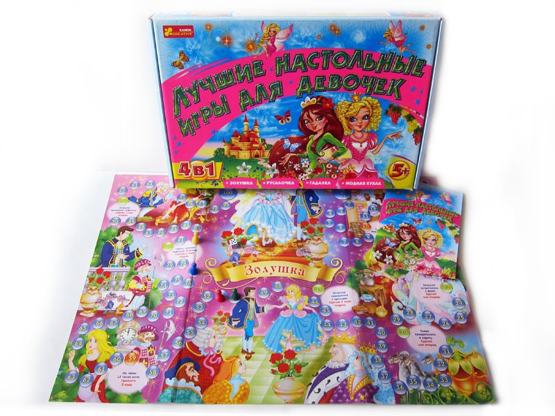 Единственное, что понравилось, это рисунки на игровых полях и красивая коробка. Все 4 игры - обычные ходилки, причём довольно примитивные. "Русалочка" и "Золушка" абсолютно одинаковые. В игре "Гадалка" вообще насмешили, когда попадаешь на клетку "узнай, на кого похож твой суженый" (рекомендуемый возраст от 5 лет)- пришлось объяснять 6-летней дочке, кто это - суженый. Прежде чем играть, игровые поля из тонкого картона надо положить под пресс, чтобы их распрямить, иначе фишки съезжают.
