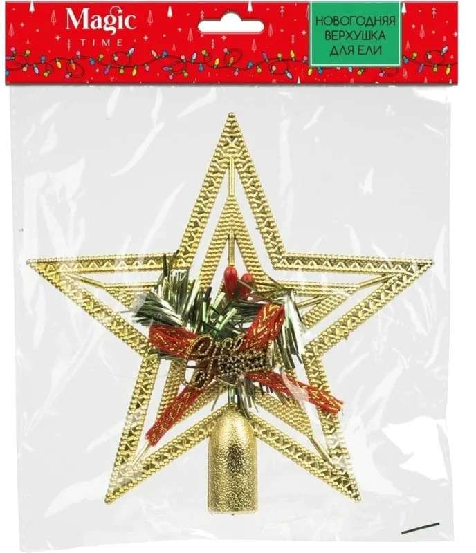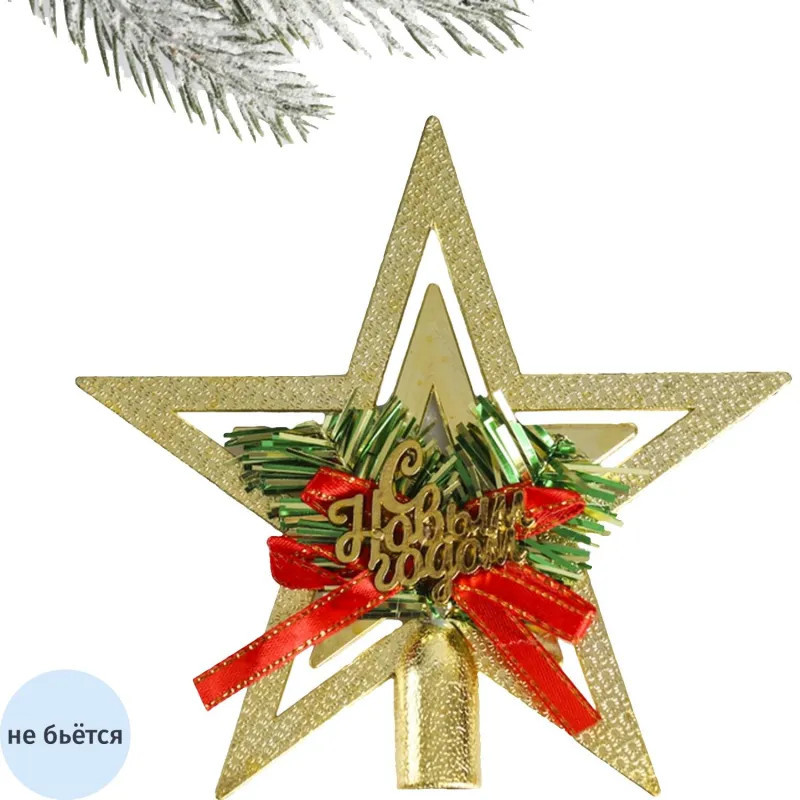 Ажурная верхушка в форме золотистой звезды гармонично сочетается с любым декором. В центре — композиция из искусственной хвои, украшенная красной лентой и поздравительной надписью. Поверхность с изящным декоративным узором будет красиво преломлять свет от новогодней гирлянды, создавая эффектное сияние. Эта рождественская покупка наполнит ваш дом атмосферой праздника. Она идеально дополнит вашу коллекцию декора, порадует родных и близких, а также станет отличным новогодним подарком для друзей и коллег. Поставляется в прозрачном пакете. Размер звёзды на ёлку — 15×15×1.5 см.
