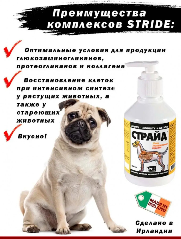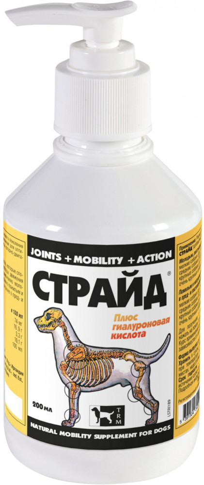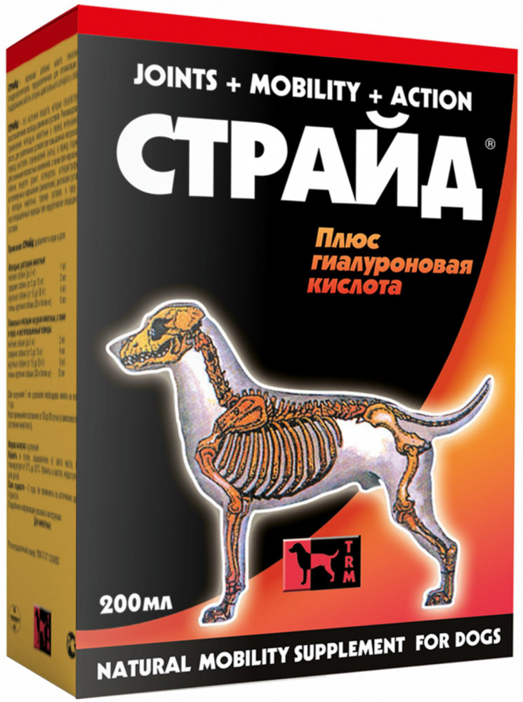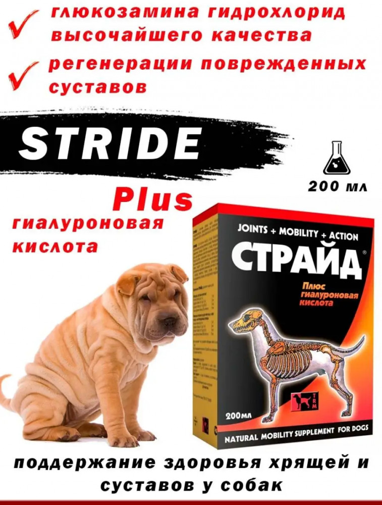 Страйд плюс для собак 200 мл — натуральный препарат для собак, обеспечивающий лёгкость движения. Глюкозамин + МСМ + хондроитин + гиалуроновая кислота — уникальный препарат для собак, предотвращающий поражение тканей суставов. В последнее время в хирургической практике стали часто встречаться патологии, связанные с заболеванием суставов у собак, причинами которых являются: генетическая предрасположенность у таких пород как сенбернар, немецкая и восточно-европейская овчарка, лабрадор-ретривер, такса и т.д.; дисплазия суставов; возрастные изменения; климатические факторы (сезонное обострение хронических процессов; неблагоприятные климатические условия для проживания некоторых пород собак, привезённых из других регионов (бордосский дог, мастино наполитано, фило бразилейро, мастифы, тоса-ину и др.); простудный фактор; нарушение обмена веществ, в частности витаминно-минерального обмена (остеопороз, рахит, остеодистрофия); аутоиммунные нарушения (ревматизм); гиподинамия.