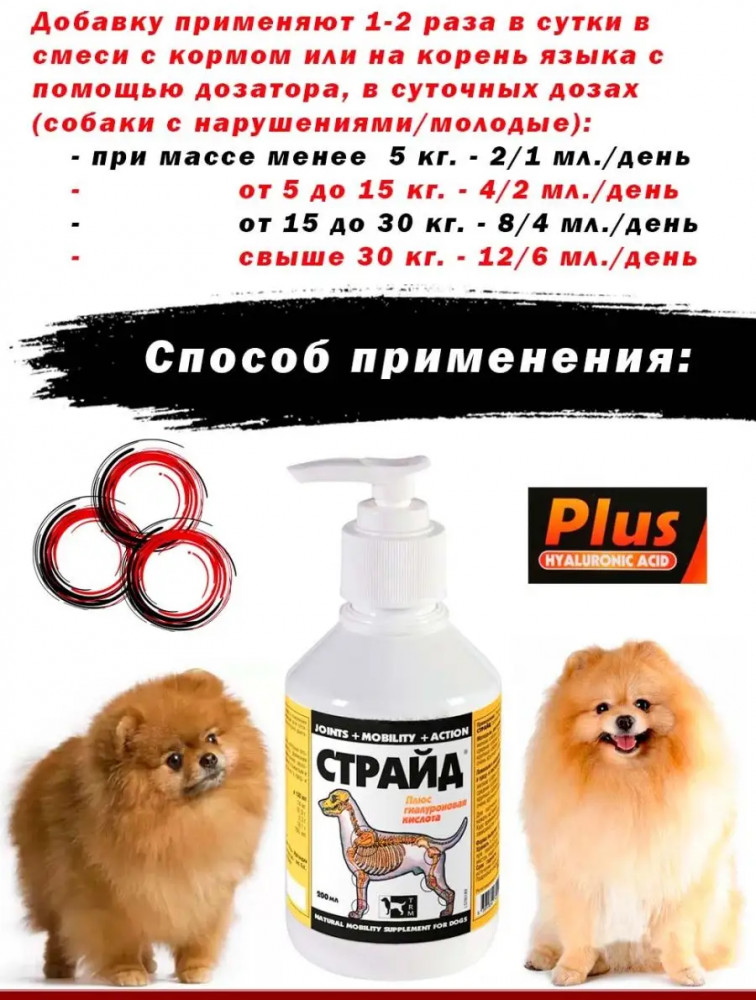 Страйд плюс — это высокоэффективный препарат, относящийся к новому поколению хондропротекторов, предназначенных для профилактики и лечения воспалительных и дегенеративных заболеваний суставов у собак. Рекомендуется щенкам для укрепления хрящевой ткани ушных раковин.
