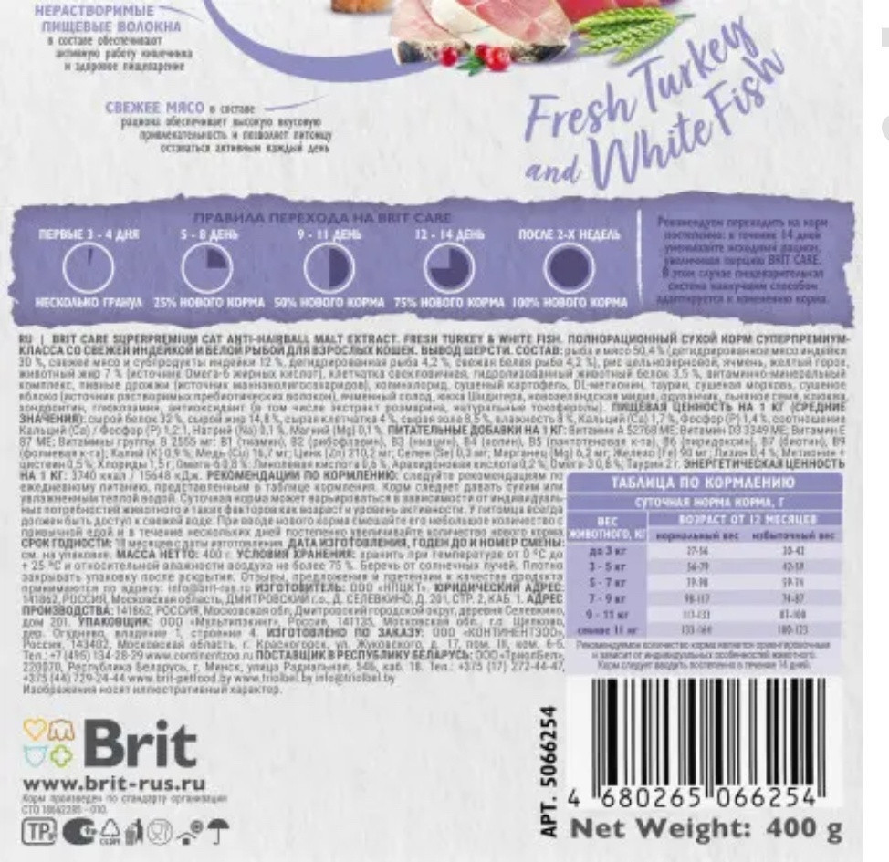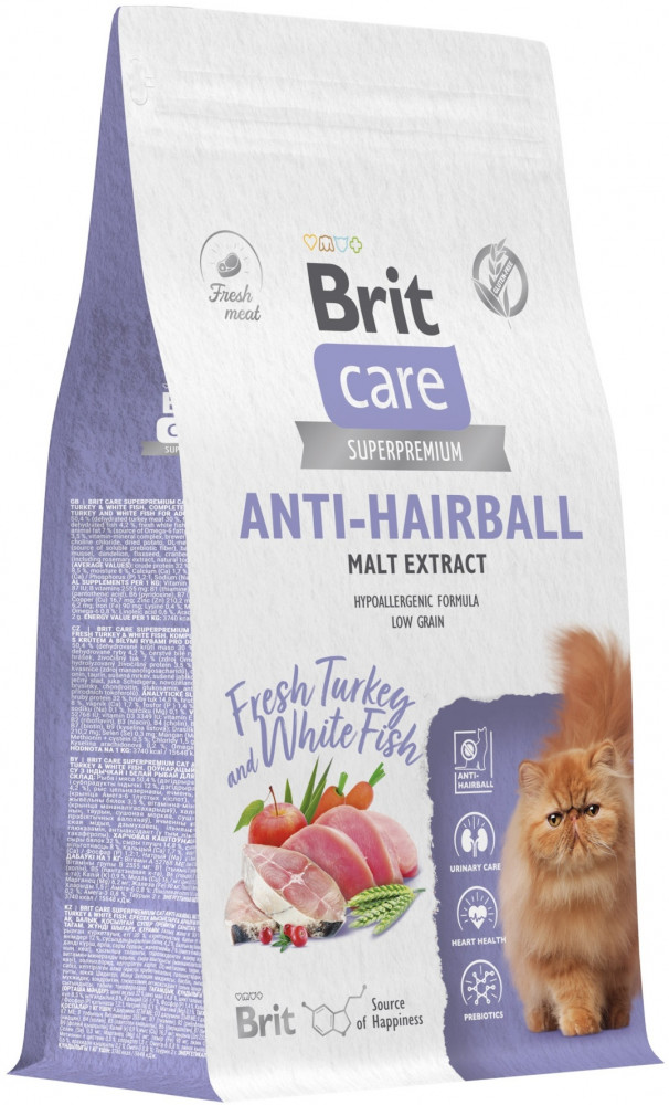 Brit Сухой корм для взрослых кошек с белой рыбой и индейкой «Anti-Hairball»