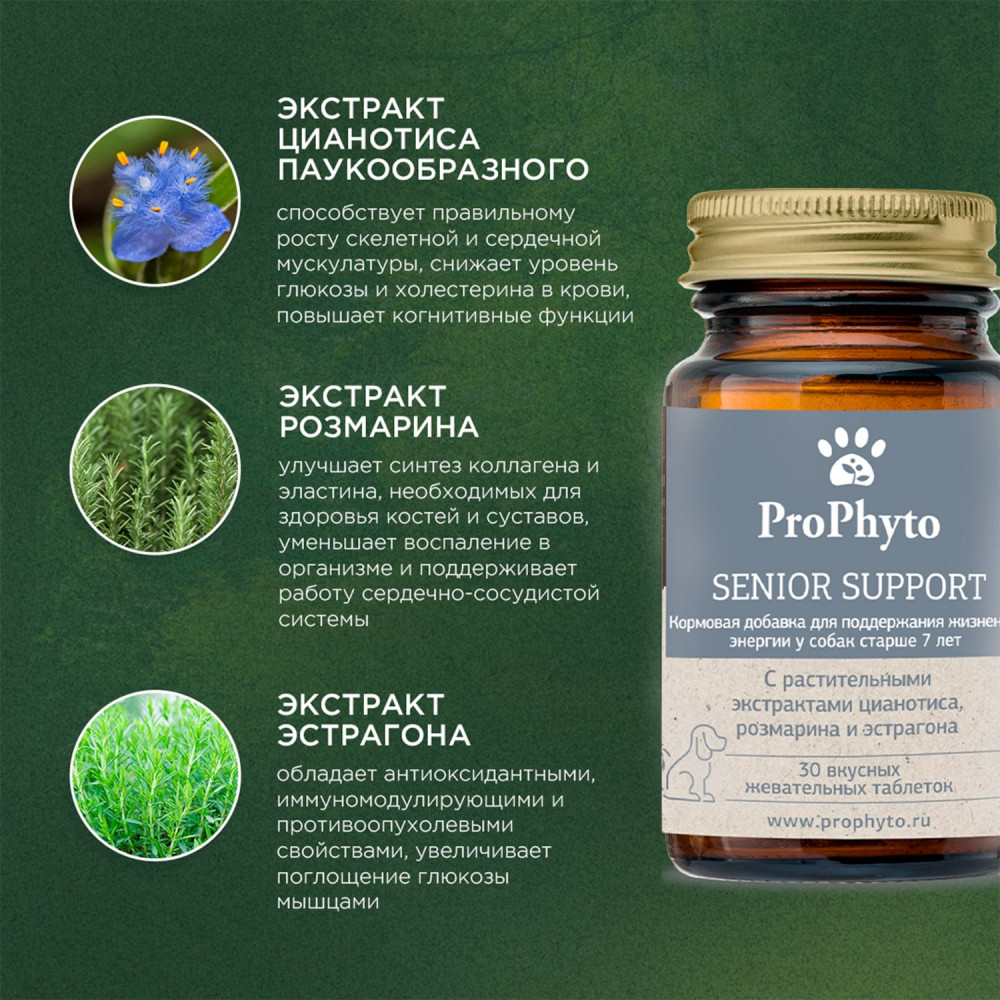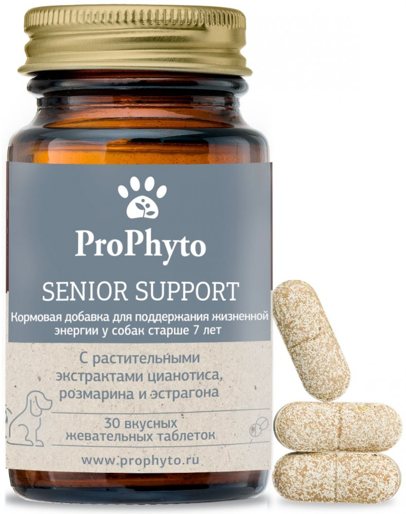 ProPhyto Кормовая добавка для поддержания жизненной энергии у собак старше 7 лет «Senior Support»новинка В данный момент этот товар отсутствует в продаже. Возможно, у нас найдется аналогичный или похожий товар здесь. ПроФито Сеньор Саппорт — функциональная кормовая добавка для собак. Применяется животным старше 7-ми лет для нормализации состояния костно-хрящевой системы и улучшения уровня обмена веществ. Действия добавки обусловлены входящими в ее состав растительными экстрактами, богатыми флавоноидами. Флавоноиды проявляют высокую биологическую активность и участвуют в широком спектре реакций метаболизма, оказывают выраженное антиоксидантное действие, улучшают состояние стенок капилляров и хрящевой ткани. |