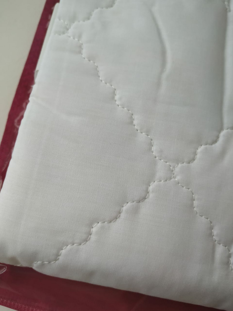 Материал белый хлопок, без рисунка, простеганный, изнутри уплотнен. Молния сбоку, скрыта. Одно но - внутренние швы не обработаны, нитки торчат, придется оверложивать самостоятельно или использовать как есть. Каждый чехол приходит в индивидуальном пакете-чехле. Удобная вещь. Уже пользуемся.
