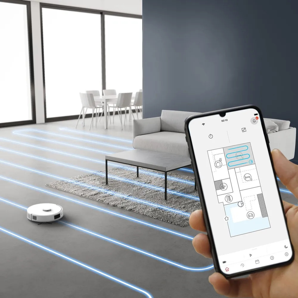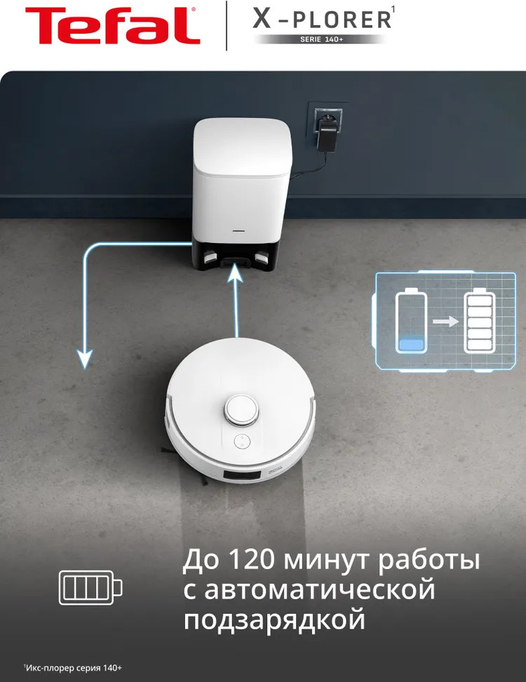 Надежный и емкий Li-ion аккумулятор обеспечивает до 120 минут автономной работы без подзарядки. Этого времени хватит, чтобы убрать большую квартиру или дом. Сухая и влажная уборка одновременно. Боковая щетка предназначена для уборки в углах и труднодоступных местах, центральная щетка — для сбора крупного мусора и пыли. Для деликатной чистки напольного или коврового покрытия можно задать запретные зоны для влажной уборки в приложении.