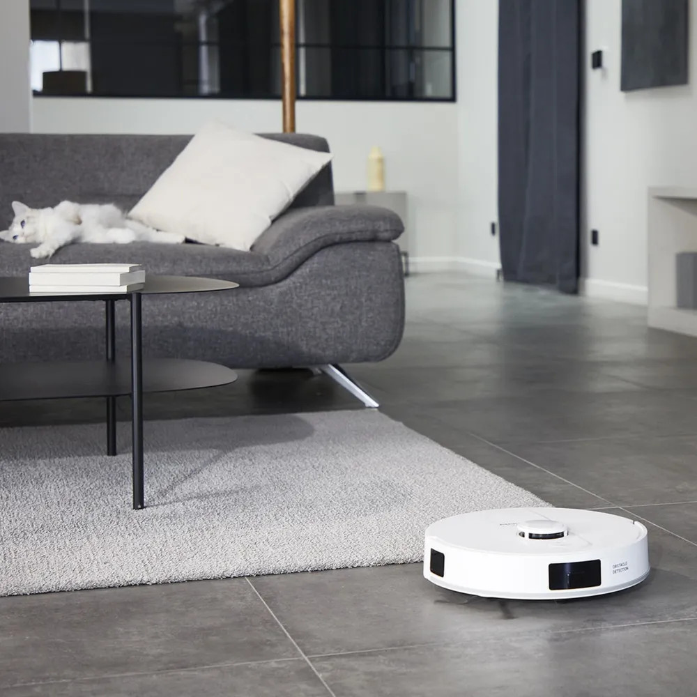 Робот-пылесос автоматически вернется на станцию в конце уборки или если уровень заряда батареи слишком низкий. Робот-пылесос оснащен датчиками защиты от падения для распознавания лестниц. В случае их обнаружения он сменит направление. Робот-пылесос оснащён системой самоочистки: полностью автоматизированный процесс не требует вашего участия, кроме замены пылесборников. Когда мешок для сбора пыли заполнен, световой индикатор станции мигает красным цветом.