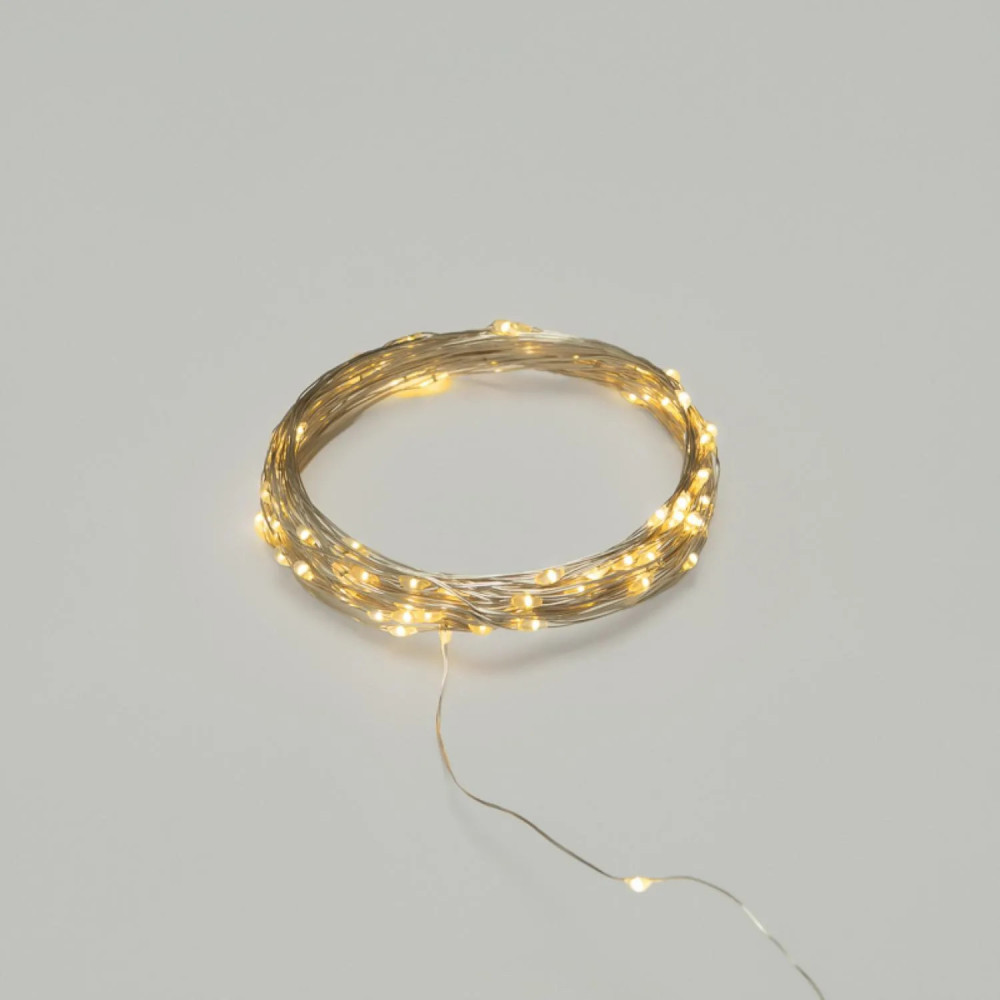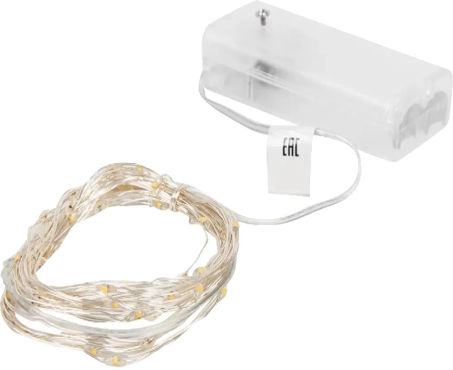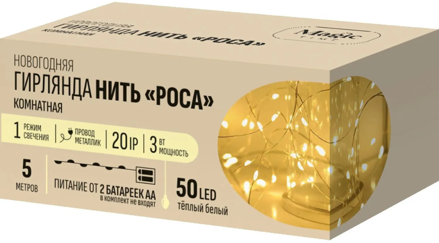 Электрогирлянда Magic Time Нить тёплый белый свет 50 светодиодов (5 м). Новогодняя электрогирлянда Роса будет необычно смотреться на ёлке. Выглядывая из ветвей, гирлянда оживляет ёлку, придавая ей утончённость и изящность. Гирлянды набирают все большую популярность для декора помещений. Их все чаще используют в качестве интерьерного украшения на любые праздники и даже в течение всего года. Эта гирлянда привнесёт в дом ощущение настоящего праздника и радости. Каждая гирлянда поставляется в индивидуальной коробке. Размер украшения — 500 см. Электрогирлянда имеет 50 LED-ламп тёплого белого света. Работает в 1 режиме от батареек 2 элемента питания AA. |