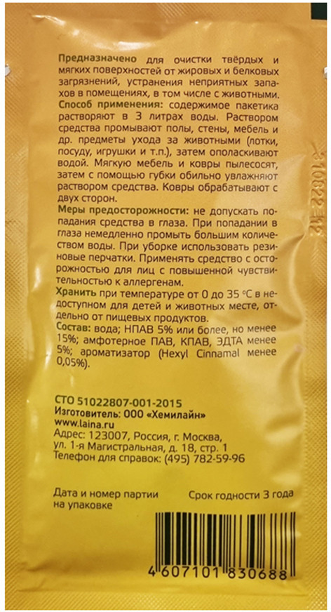 Способ применения: для устранения неприятного запаха и меток животных участки пола и коврового покрытия очищают, а затем обрабатывают губкой, смоченной в растворе 10 мл средства в 1 л воды. Безопасно для животных, после обработки не требуется смывание водой. Профилактическую дезинфекцию проводят с использованием раствора 10 мл средства на 2 л воды. Время дезинфекции 30 минут. При инфекционных заболеваниях животных готовят раствор из расчета 20-30 мл средства на 1 л воды. Этим раствором обрабатывают стены, полы, мебель, туалеты, ковровые покрытия. Время дезинфекции 3-4 часа. Игрушки, посуду, щетки замачивают в растворе на 2 часа, затем прополаскивают. Тканевые изделия замачивают на 1 час, затем стирают.