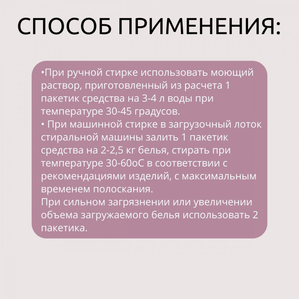 • при ручной стирке использовать моющий раствор, приготовленный из расчета 1 пакетик средства на 3-4 л воды при температуре 30-45°С;
