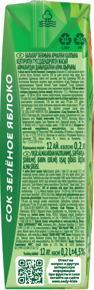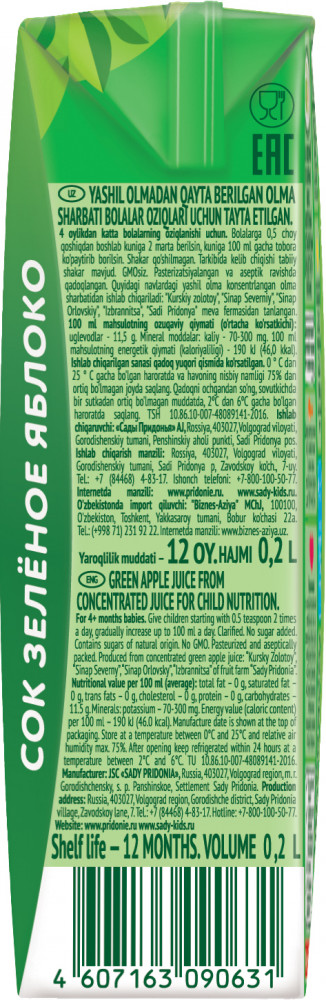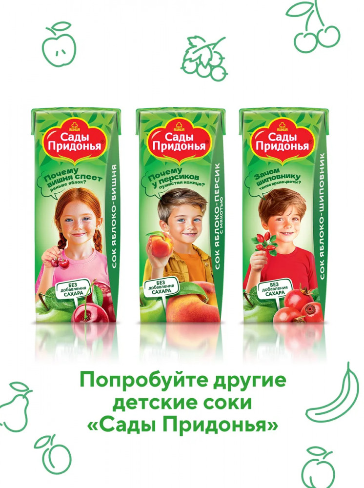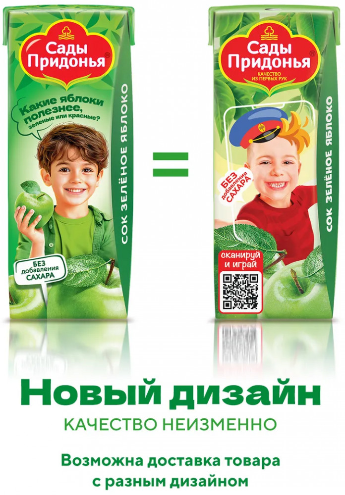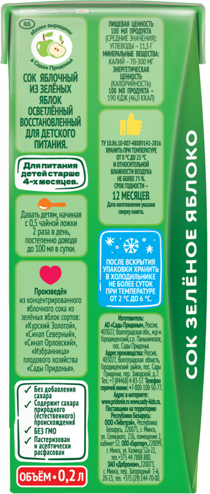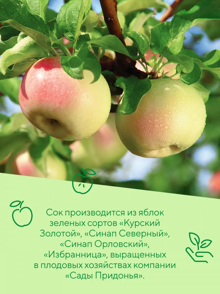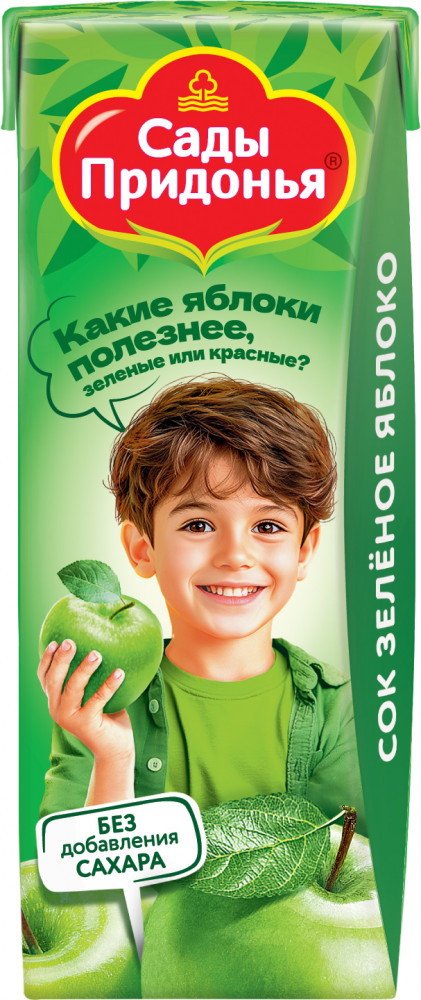 Сок «Сады Придонья» из зелёных яблок, выращенных с любовью и заботой в садах компании, полностью натуральный и не содержит никаких добавок. Вкус у сока сладкий с небольшой кислинкой, аромат натуральный яблочный. «Зелёное яблоко» — это самый популярный вкус в линейке соков «Сады Придонья». Обладает гипоаллергенными свойствами, подходит для первого прикорма детям старше 4 месяцев. Упаковка сока «Сады Придонья» объемом 200 мл — лучший выбор, чтобы выпить дома и на прогулке, взять с собой в школу.