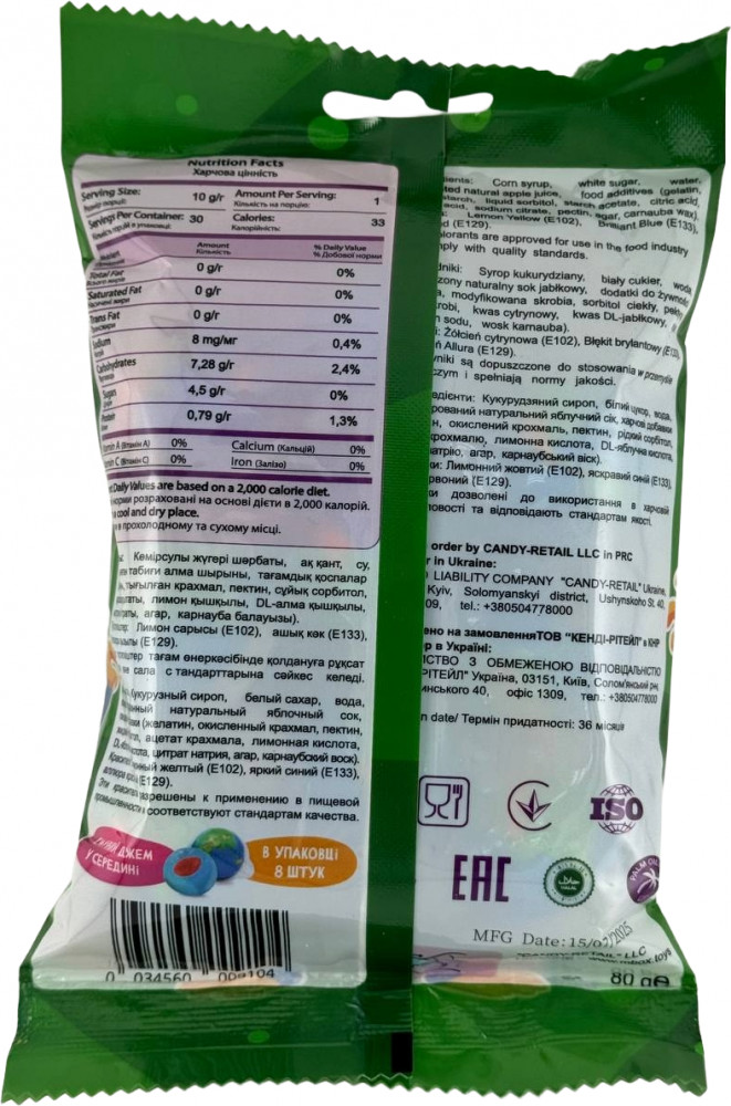 Кукурузный сироп, белый сахар, вода, концентрированный натуральный яблочный сок, пищевые добавки (же-латин, окисленный крахмал, пектин, жидкий сорбитол, ацетат крахмала, лимонная кислота, DL-яблочная кислота, цитрат натрия, агар, карнаубский воск). Красители: Лимон желтый (Е102), яркий синий (Е133), аллора красный (Е129). Эти красители разрешены к применению в пищевой промышленности и соответствуют стандартам качества.