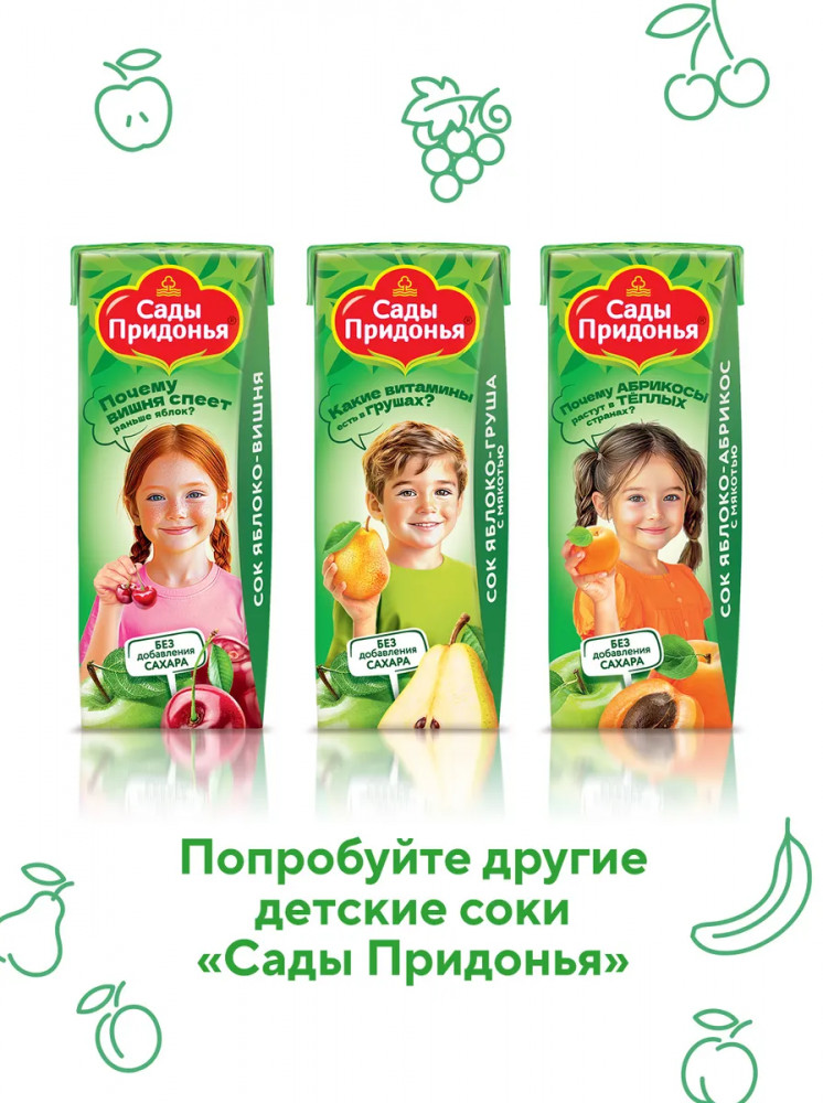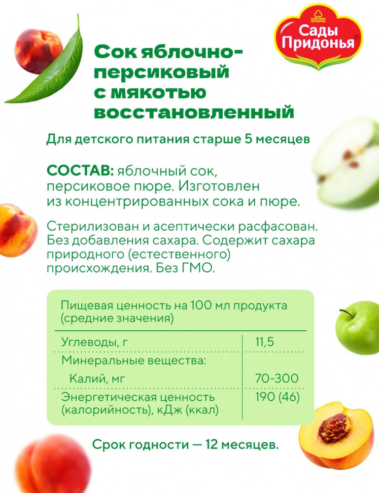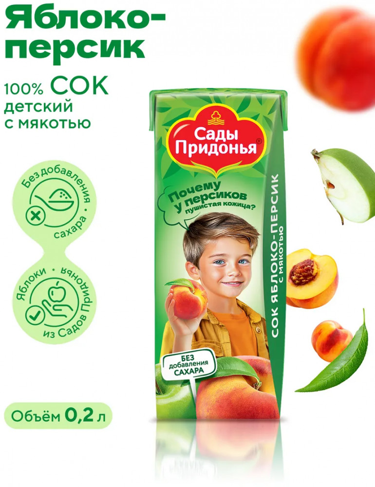 Сок «Сады Придонья» из донских яблок и спелых персиков порадует ребенка нежным вкусом и ярким фруктовым ароматом. Натуральные соки с мякотью содержат большое количество клетчатки, которая оказывает благоприятное влияние на пищеварение. Сочетание яблок и персика является одним из самых любимых вкусов у детей. Упаковку сока «Сады Придонья» объемом 200 мл удобно взять с собой на прогулку и в школу, а также порадовать друзей вкусным угощением на праздник.