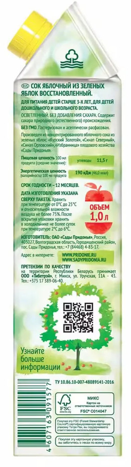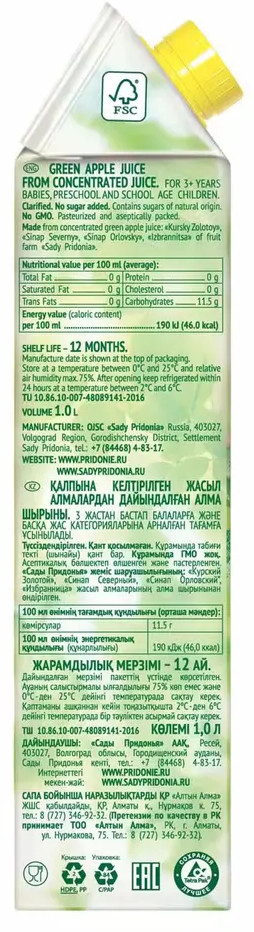 Сады Придонья Сок осветлённый восстановленный «Зелёное яблоко»