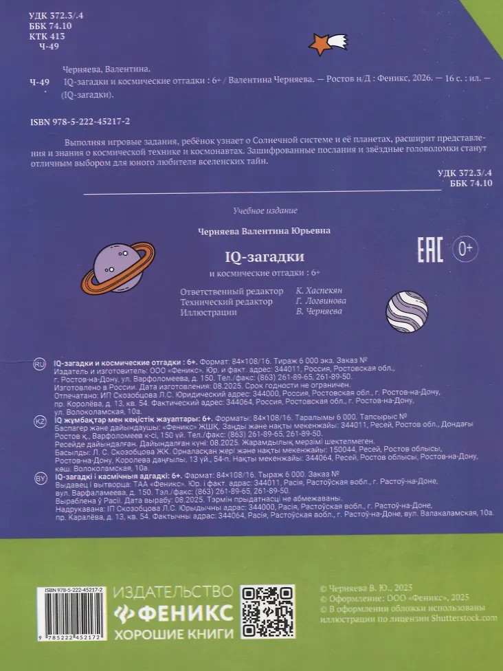 Серия: IQ-загадки Выполняя игровые задания, ребенок узнает о Солнечной системе и ее планетах, расширит представления и знания о космической технике и космонавтах. Зашифрованные послания и звёздные головоломки станут отличным выбором для юного любителя вселенских тайн. |