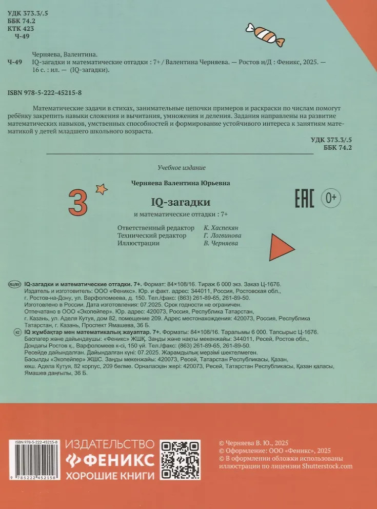 💳 Оплатить за товар можно при получении 🇰🇿 Есть бесплатная доставка по Казахстану от 1 дня 🎁 Копите бонусы с каждой покупки Серия: IQ-загадки Математические задачи в стихах, занимательные цепочки примеров и раскраски по числам помогут ребёнку закрепить навыки сложения и вычитания, умножения и деления. Задания направлены на развитие математических навыков, умственных способностей и формирование устойчивого интереса к занятиям математикой у детей младшего школьного возраста. |