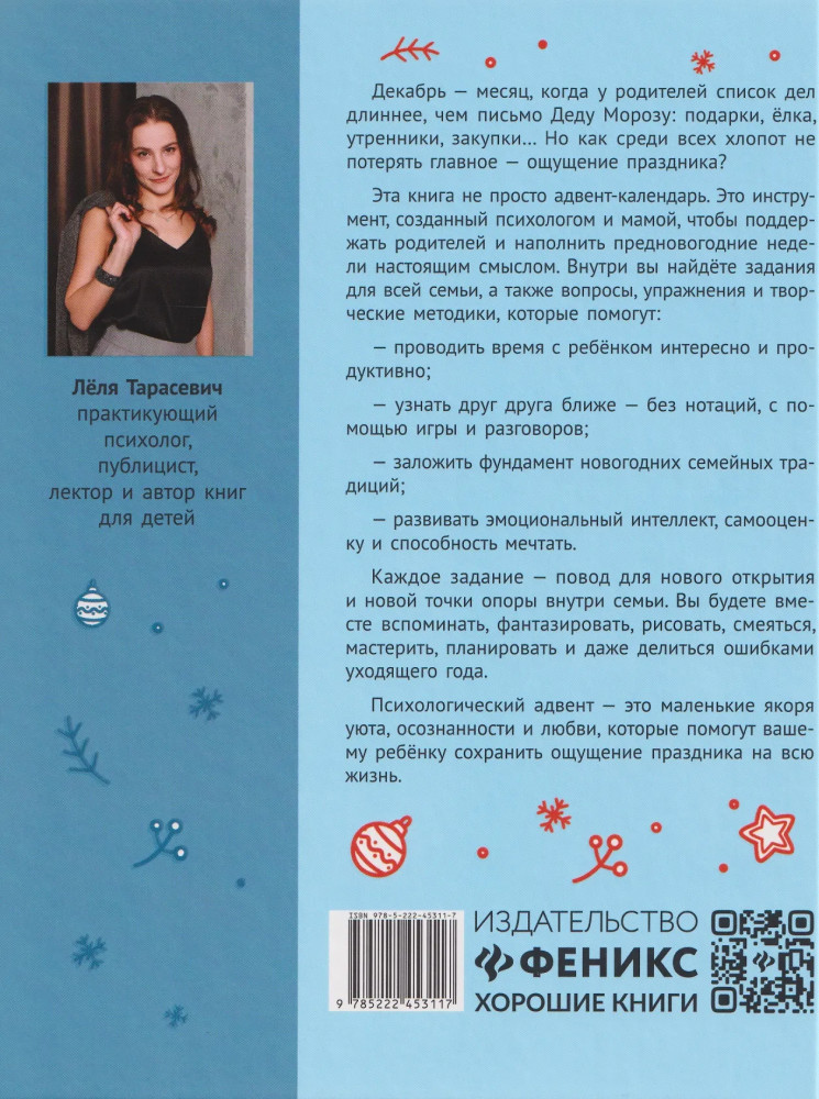 Эта книга не просто адвент-календарь. Это инструмент, созданный психологом и мамой, чтобы поддержать родителей и наполнить предновогодние недели настоящим смыслом. Внутри вы найдёте задания для всей семьи, а также вопросы, упражнения и творческие методики, которые помогут: