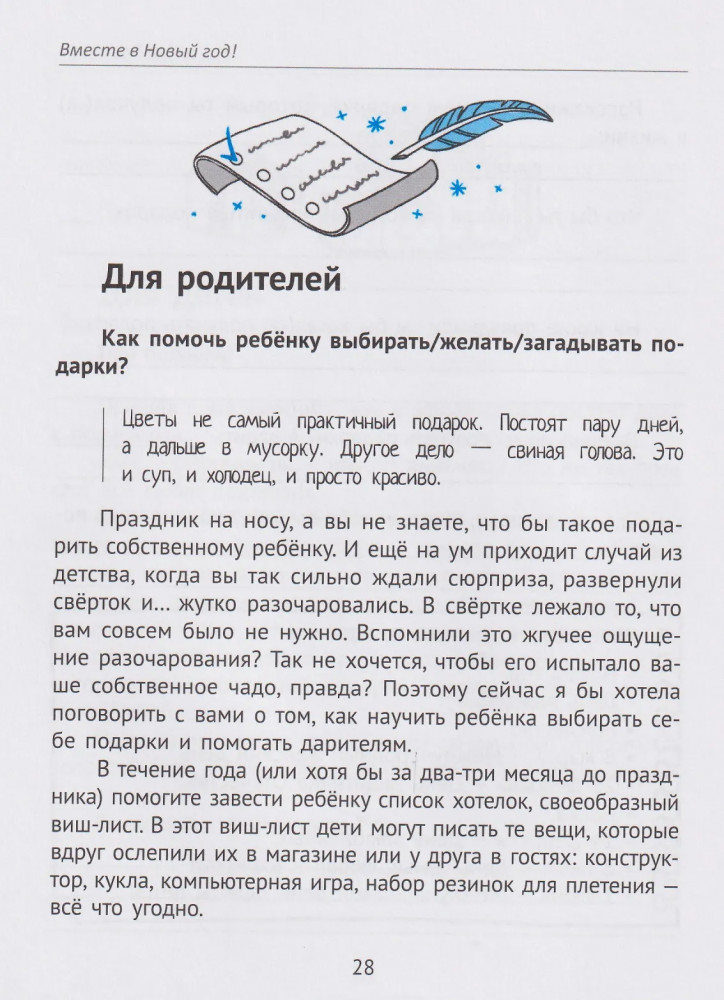 Каждое задание — повод для нового открытия и новой точки опоры внутри семьи. Вы будете вместе вспоминать, фантазировать, рисовать, смеяться, мастерить, планировать и даже делиться ошибками уходящего года. Психологический адвент — это маленькие якоря уюта, осознанности и любви, которые помогут вашему ребёнку сохранить ощущение праздника на всю жизнь. |
