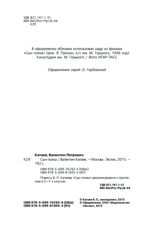 В данный момент этот товар отсутствует в продаже. Возможно, у нас найдется аналогичный или похожий товар здесь. Серия: Внеклассное чтение Повесть В. П. Катаева "Сын полка" рекомендована к прочтению в 5 - 7 классах.