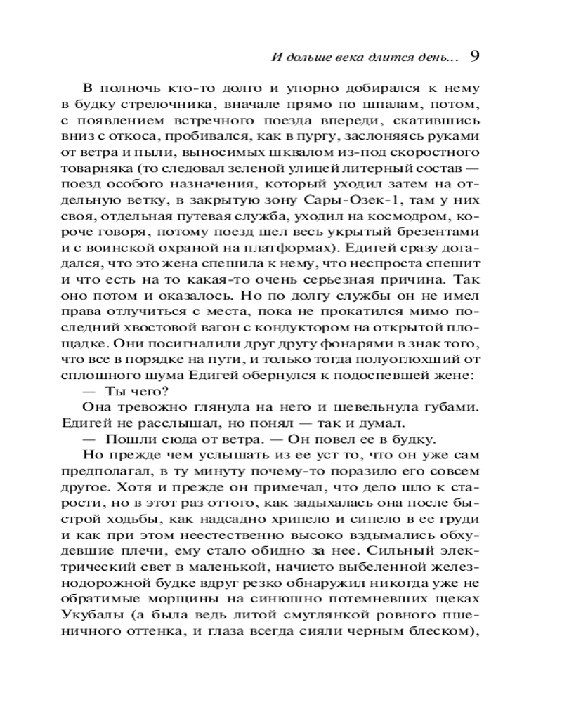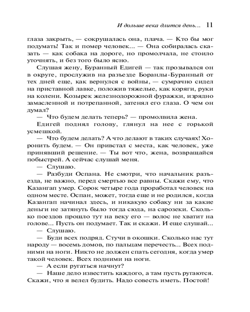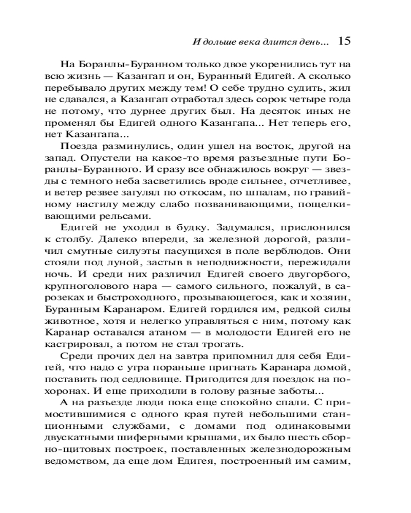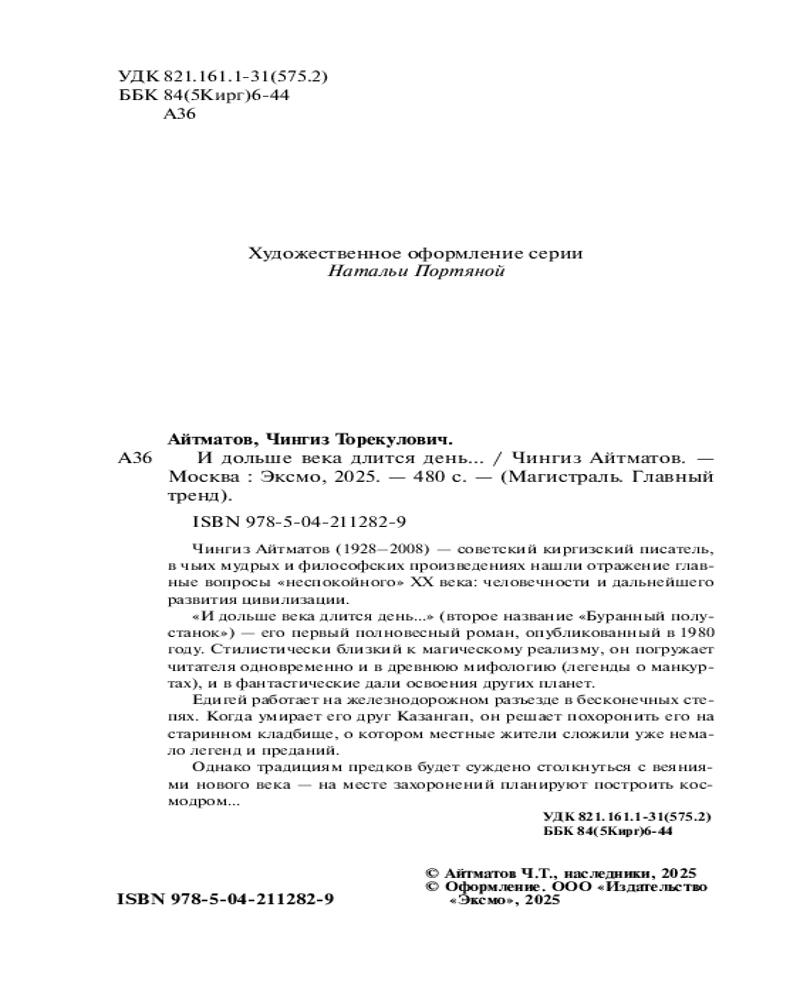Серия: Магистраль. Главный тренд Чингиз Айтматов (1928–2008) — советский киргизский писатель, в чьих мудрых и философских произведениях нашли отражение главные вопросы «неспокойного» XX века: человечности и дальнейшего развития цивилизации. «И дольше века длится день...» (второе название «Буранный полустанок») — его первый полновесный роман, опубликованный в 1980 году. Стилистически близкий к магическому реализму, он погружает читателя одновременно и в древнюю мифологию (легенды о манкуртах), и в фантастические дали освоения других планет. |