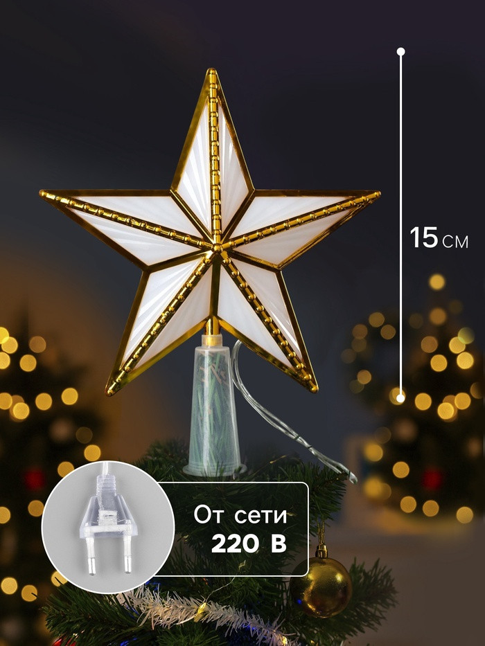 Традиционное украшение ёлочной верхушки в виде звезды привычно всем с детства. Новогодняя фигура не требует расходов на монтаж. Просто установите её в нужное место и подсоедините к сети. При выключенном свете аксессуар засияет наравне с гирляндой. Современные диоды не нагреваются, в отличие от ламп накаливания, что делает фигуру безопасной в эксплуатации. Верхушка на елку светодиодная «Звезда золотистая», 15 см, 10 LED, 220 В, свечение мульти. |