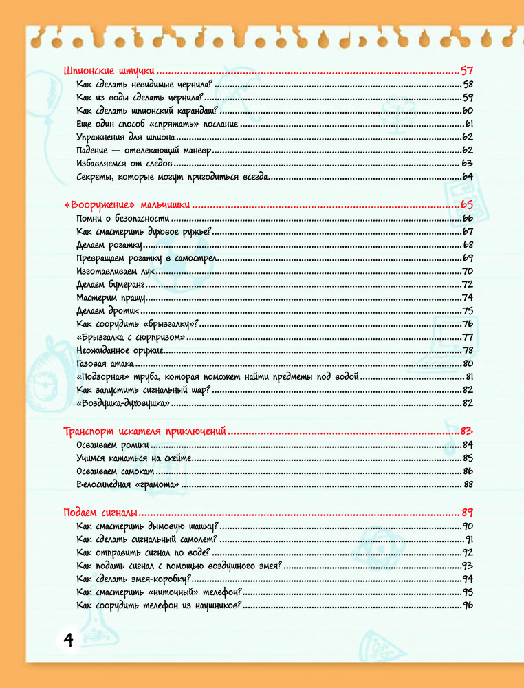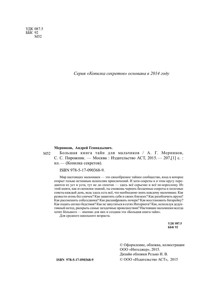 Большая книга тайн для мальчиковСветлана Сергеевна Пирожник, Андрей Геннадьевич Мерников В данный момент этот товар отсутствует в продаже. Возможно, у нас найдется аналогичный или похожий товар здесь. Серия: Копилка секретов Мир настоящих мальчишек — это тайное сообщество, вход в которое открыт только истинным искателям приключений. Секреты здесь передаются из уст в уста, и тут уж не до сплетен — всё серьезно и всё по-взрослому. Из этой книги, как из копилки знаний, ты сможешь черпать бесценные секреты и полезные советы на каждый день. Здесь ты найдешь всё, что необходимо знать каждому мальчишке. Как развести огонь без спичек? Как разоблачить вруна? Как рассмешить собеседника? Как расшифровать почерк? Как восстановить батарейку? Как подать сигнал бедствия? Как не запутаться в сетях Интернета? Настоящие мальчишки всегда хотят бОльшего — именно для них и создана эта «Большая копилка секретов для мальчиков». |