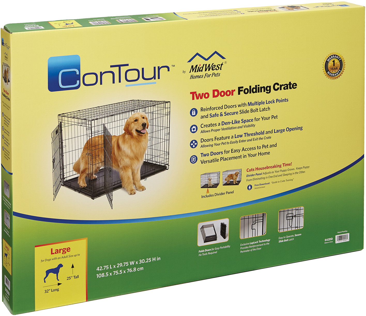 Устойчивая, крепкая клетка выполнена из качественного металла, обеспечивает безопасность животного и хозяина. Клетки Contour оснащены эксклюзивной технологией замка LapLock. Данная технология создает несколько точек блокировки по периметру двери для дополнительной безопасности в сочетании с безопасными и простыми в использовании защелками с задвижкой. Двери также имеют низкие пороги и большие отверстия, позволяя домашним животным легко входить и выходить из клетки. Двери расположены на смежных боковых сторонах.