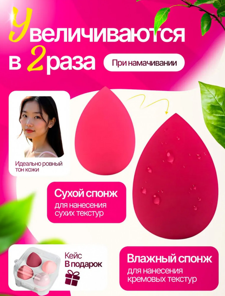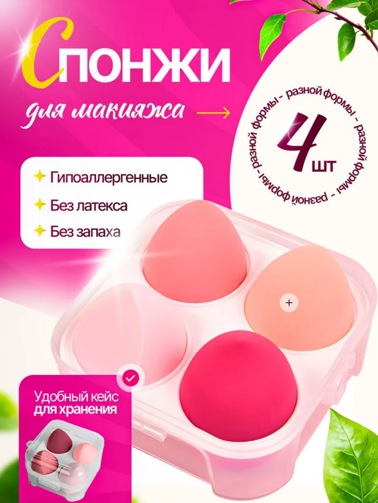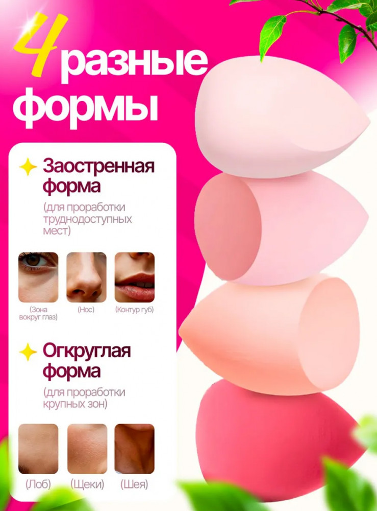 Спонж для макияжа лица — это незаменимый аксессуар в вашей косметичке. Он предназначен не только для нанесения тонального крема или консилера, но и для равномерного растушевывания пудры и румян. В наборе вы найдете 4 каплевидных спонжей с разными срезами, которые также называются спонж яйцо. Изготовленные из полиуретана, эти спонжи являются 100% гипоаллергенными и не имеют посторонних запахов.