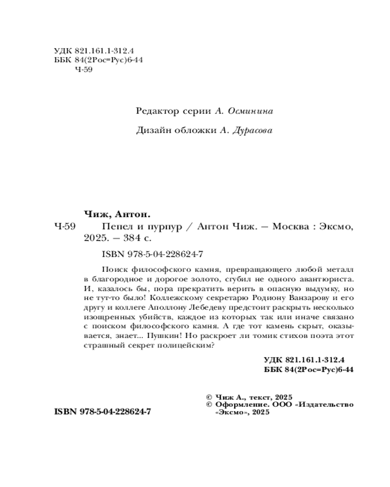 Серия: Исторические детективы Антона Чижа (обложка) (цикл «Ванзаров») Поиск философского камня, превращающего любой металл в благородное и дороге золото, сгубил не одного авантюриста. И, казалось бы, пора прекратить верить в опасную выдумку, но не тут-то было! Коллежскому секретарю Родиону Ванзарову и его другу и коллеге Аполлону Лебедеву предстоит раскрыть несколько изощренных убийств, каждое из которых так или иначе связано с поиском философского камня. А где тот камень скрыт, оказывается, знает... Пушкин! Но раскроет ли томик стихов поэта этот страшный секрет полицейским? |