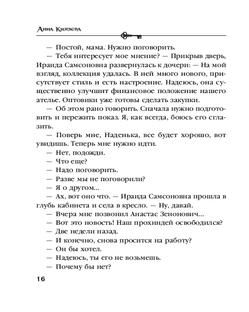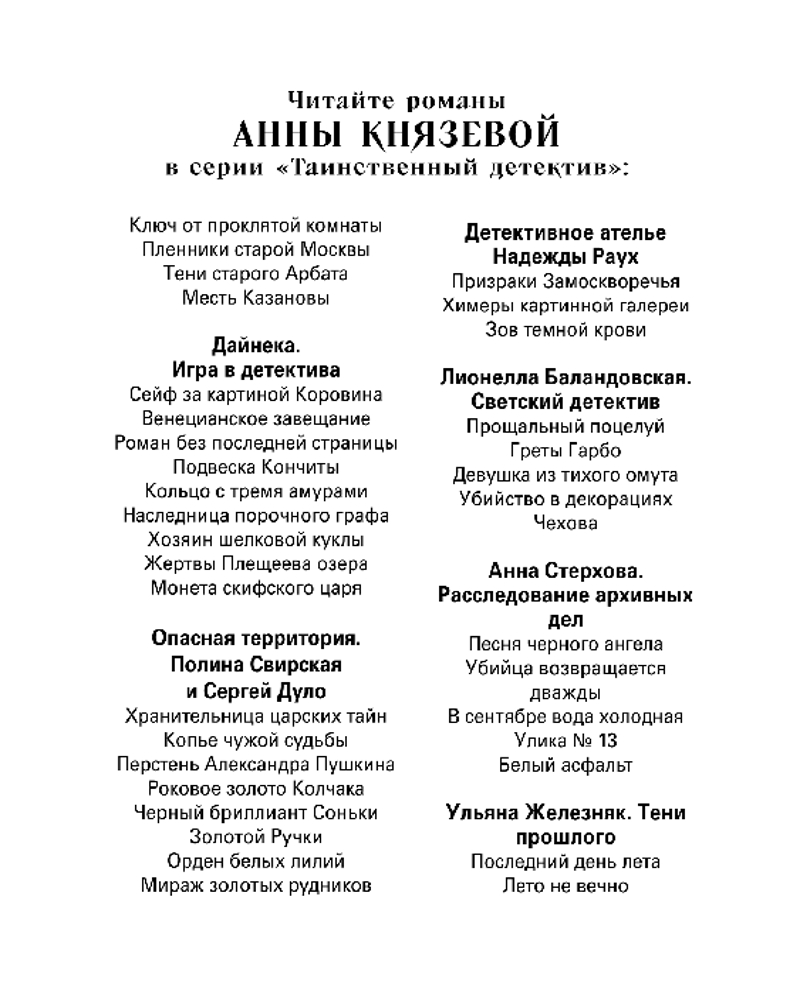 Серия: Таинственный детектив Анны Князевой. Новые истории (обложка) Такого еще не бывало — в модном ателье Надежды Раух обосновалась следственная группа! В соседнем дворе во время стройки были обнаружены давние захоронения, и Надежда вместе со своими сотрудниками волей-неволей оказалась вовлечена в расследование. Казалось бы, трудно придумать более мирное занятие, чем пошив одежды. Но следы старого преступления привели прямо в ателье! Неужели среди респектабельных клиентов Надежды могут обнаружиться убийцы или их жертвы? Дело осложняется тем, что в состав следственной группы входит возлюбленный Надежды Лев Астраханский, а в последнее время у них довольно натянутые отношения... |